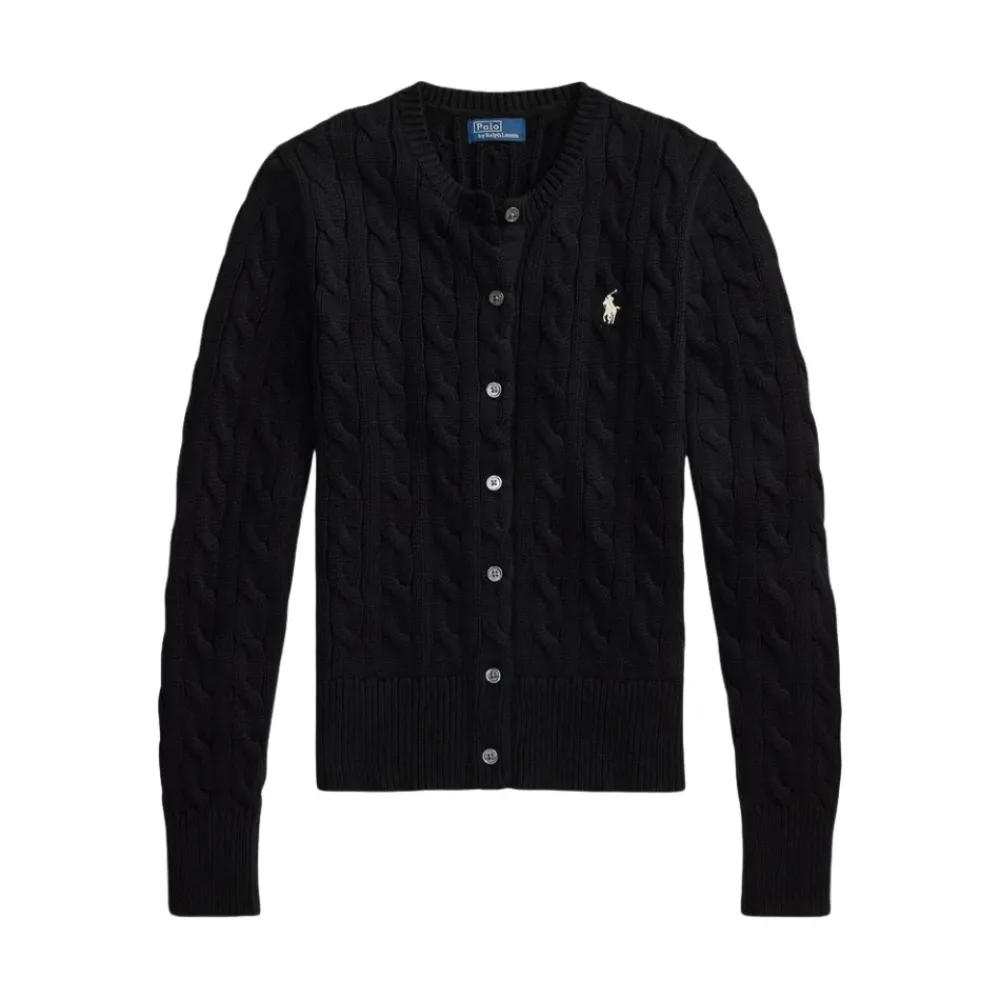 Ralph Lauren Cable Knit Cardigan med Knapper og Rund Halsudskæring kombinerer klassisk kabelstrikstruktur med praktiske knaplukninger for nem lag-på-lag påklædning. Designet til hverdagsbrug og tilføjer struktureret varme, mens den fremviser brandets broderede logo. Vigtige egenskaber: Sort | Knaplukning | Rund hals | Lange ærmer | Kabelstrik | Broderet logo