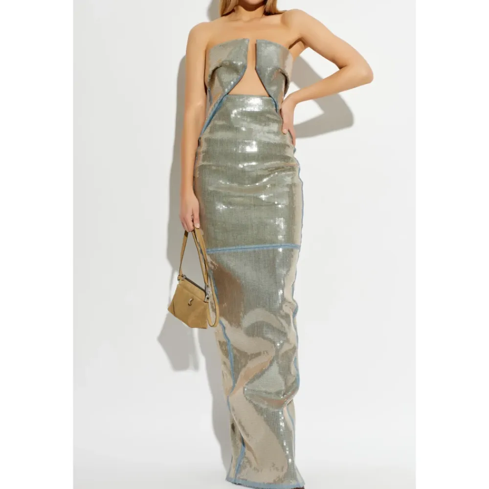 Rick Owens Off-shoulder Kjole kombinerer en figursyet maxi-silhuet med en markant geometrisk udskæring ved busten, udført i et skinnende, pailletbesat mesh. Ideel til formelle lejligheder, der kræver et avantgarde, skulpturelt udtryk. Vigtigste egenskaber: Blå | Bomuld | Stretch | Off-shoulder halsudskæring | Geometrisk udskæring ved busten | Lang figursyet maxi-silhuet | Geometriske paneler og skulpturelle snit | Fin pailletbesætning | Let gennemsigtig mesh-overlay | Dimensioner & pasform: Modelhøjde: 177 cm | Buste: 83 cm | Talje: 61 cm | Hofter: 89 cm | Modellen bærer størrelse: 40 | Figursyet maxi-silhuet | Lang længde | Sammensætning & pleje: Bomuld | Elastomultiester | Pailletter | Mesh