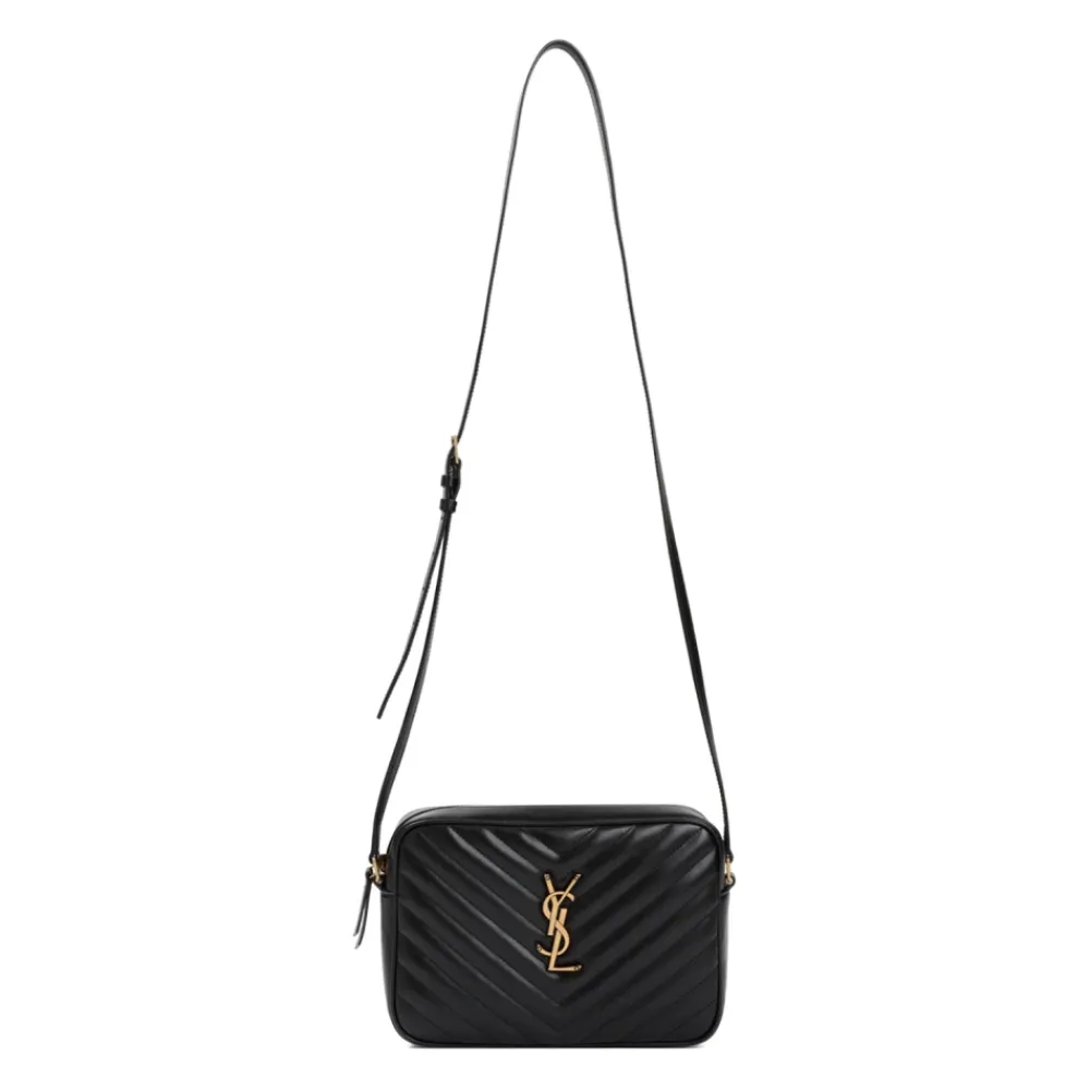 Løft din stil med SAINT LAURENT Lou Bag, lavet af luksuriøst sort kalveskind. Denne elegante skuldertaske har en guldtonet YSL-logo, lynlås og justerbar rem. Mål: 22 cm B x 16 cm H x 6 cm D.