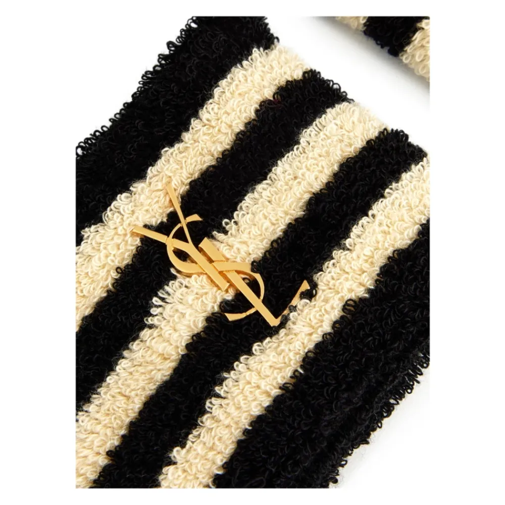Løft din stil med Saint Laurent Cassandre YSL Logo Manchetter i sort og elfenben. Disse elegante manchetter er fremstillet i Italien og giver et sofistikeret touch til enhver accessories-samling. Produkt detaljer: Sort | Elfenben | Terrycloth | YSL logo | Symmetriske striber | Sammensætning og pleje: 83% Bomuld | 16% Polyamid | 1% Elastan