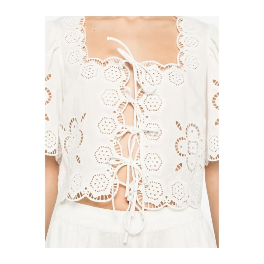Sea NY Babette Top er en luftig blondebluse designet til et afslappet, poleret look. Den har detaljer med bindebånd foran og takkede kanter, der løfter outfits til varmt vejr. Nøgleattributter: Hvid | Bomuld | Lukning med bindebånd foran | Firkantet halsudskæring | Albuelange ærmer | Blomsterblondebroderi | Takket søm | Dimensioner og pasform: Afslappet pasform | Sammensætning og pleje: Yderstof: 100% bomuld | Broderi: 100% polyester