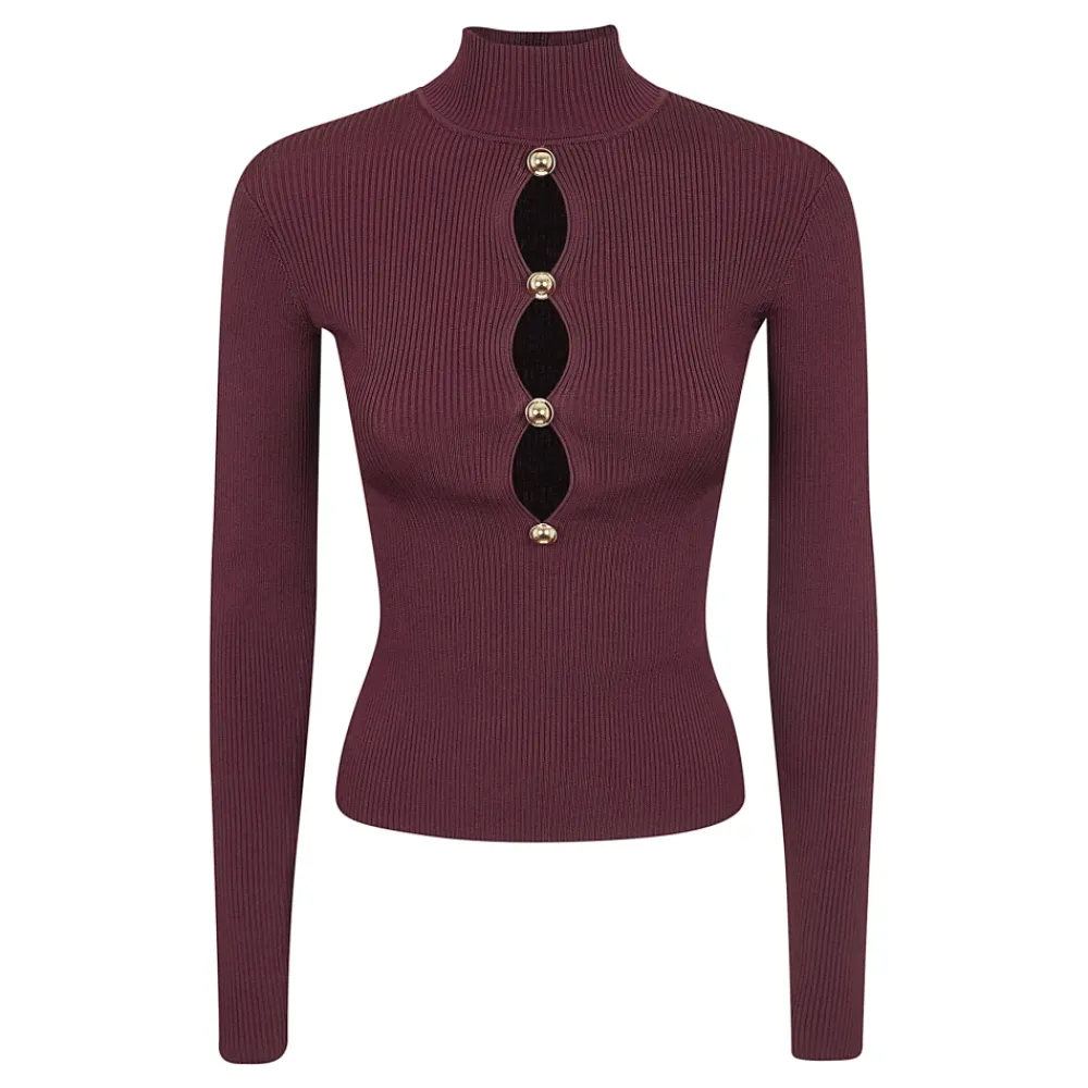 Self‑Portrait Keyhole Strik Top kombinerer en høj hals ribstrik med dristige keyhole-udskæringer foran og guldfarvede knapper. Den slanke, figursyede silhuet og de udvidede ærmer gør den ideel til elegante looks fra dag til aften. Vigtige egenskaber: Burgundy | Viskose | Strækstof | Knaplukning foran | Høj hals | Keyhole-udskæringer foran | Lange udvidede ærmer | Ribstrik | Guldfarvede knapper | Figursyet silhuet | Mål & pasform: Længde — XS: 52 cm; S: 53,5 cm; M: 56 cm; L: 58,5 cm | Bryst — XS: 53 cm; S: 59 cm; M: 66 cm; L: 74 cm | Talje — XS: 57 cm; S: 63 cm; M: 70 cm; L: 78 cm | Hem — XS: 60 cm; S: 66 cm; M: 73 cm; L: 81 cm | Skulder — XS: 29,5 cm; S: 31 cm; M: 33,6 cm; L: 36,2 cm | Ærme — XS: 58,5 cm; S: 59,5 cm; M: 61,5 cm; L: 63,5 cm | Normal i størrelsen — vælg din sædvanlige størrelse | Sammensætning & pleje: 51% Viskose | 32% Polyester | 15% Polyamid | 2% Elastan