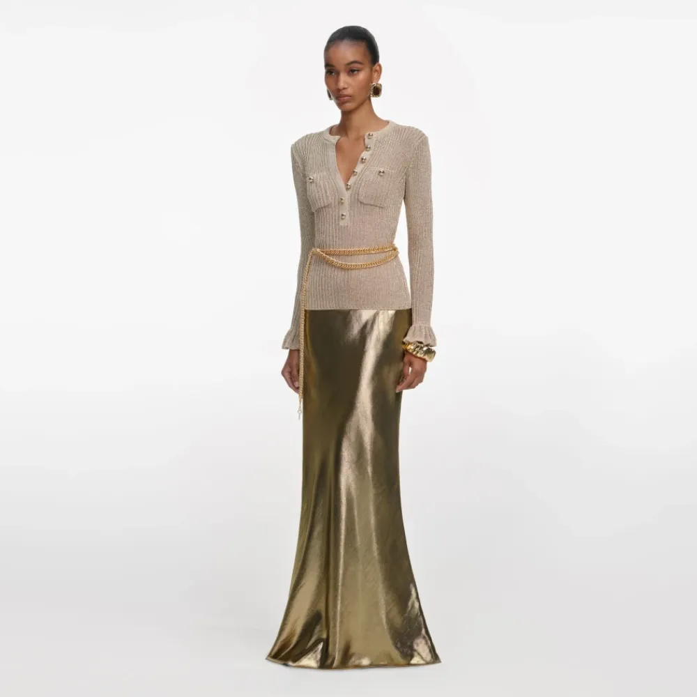 Self Portrait Lurex Ribbed Top er en metallisk strikket V-hals overdel, designet til at tilføje subtil glans til både hverdags- og aftenlooks. Dens ribbede tekstur og strækstof gør den til et elegant og behageligt valg til aftenarrangementer eller mere luksuriøse, afslappede outfits. Nøgleattributter: Gul | Guld | Viskose | Strækstof | Metallisk glans | Knaplukning | Funktionelle lommer | Bælte inkluderet | Ribbet tekstur | V-udskæring | Lange ærmer | Flæsekanter ved ærmerne | Dimensioner og pasform: Normal i størrelsen | Tætsiddende strik med stretch | Sammensætning og pleje: 65% Viskose | 35% Metalliseret fiber (Eksklusivt for kanter)