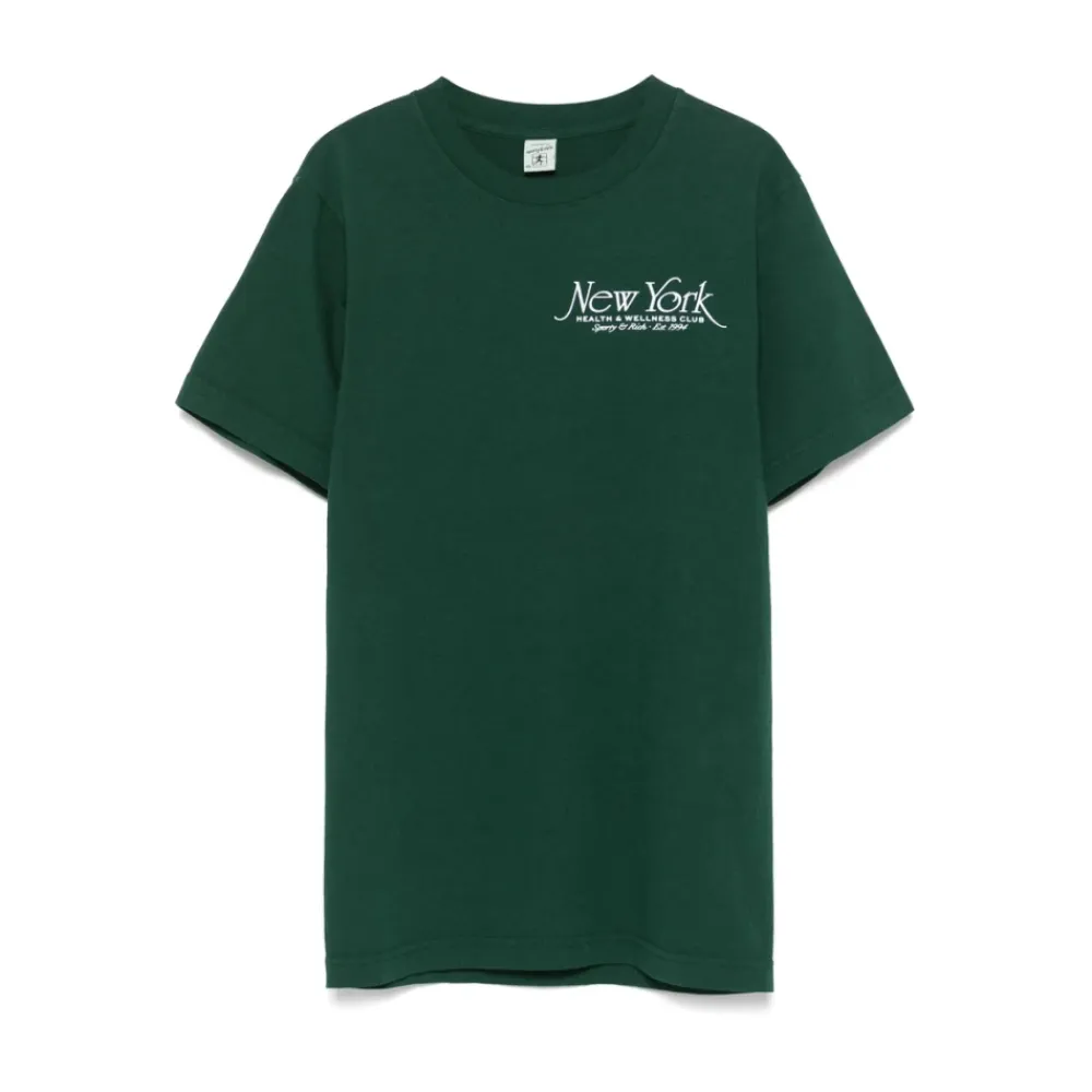 Forkæl dig selv med denne skovgrønne T-shirt med logo fra Sporty & Rich. Med rund halsudskæring og korte ærmer er denne top perfekt til den modebevidste kvinde.