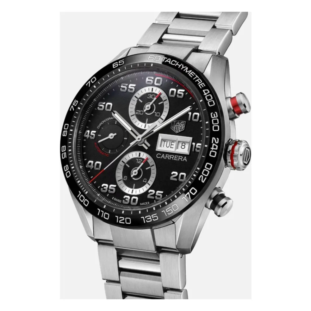 Tag Heuer Carrera Chronograph kombinerer en 44 mm stålurkasse og keramisk urkrans med Calibre 16 automatisk urværk for præcis kronograffunktion og holdbarhed i hverdagen. Vigtigste egenskaber: Sort | Sølv | Stål | Vandtæt til 100 m | Safirkrystal | Automatisk Calibre 16 urværk | Kronograf med 30-minutters og 12-timers tællere | Datovisning | H-formet stållænke | Foldelukning med trykknapper | Sort urskive med sporty røde detaljer | Keramisk fast urkrans | Påførte timeindekser | 44 mm stålurkasse | Dimensioner & pasform: Urkassediameter: 44 mm | Sammensætning & pleje: Urkasse: Stål | Lænke: Stål | Lås: Stål | Urkrans: Keramik | Krystal: Safir | Urskive: Sort