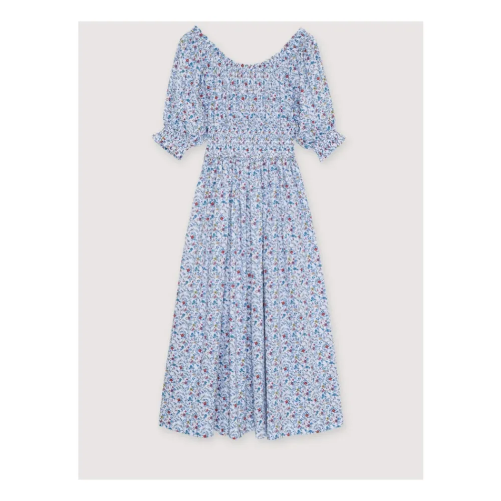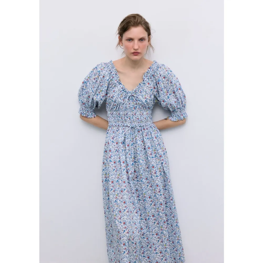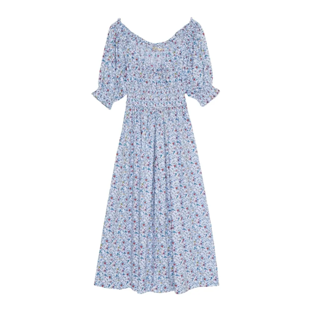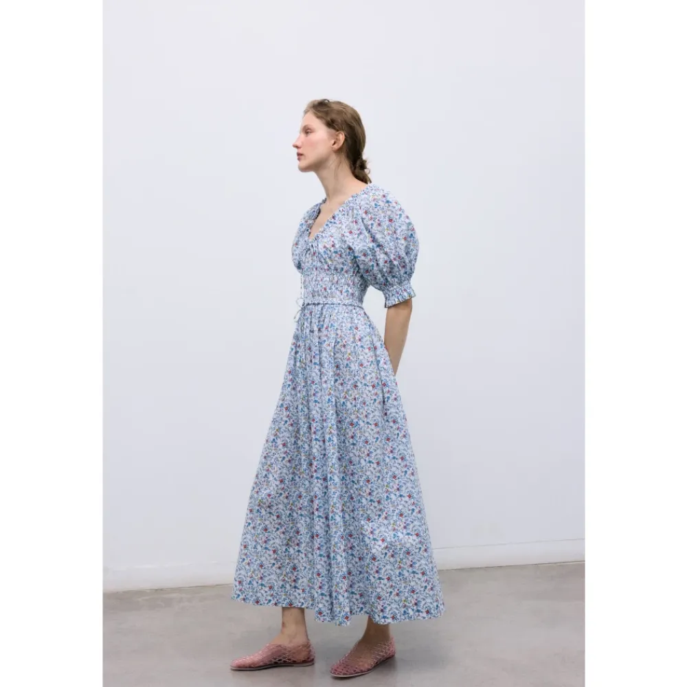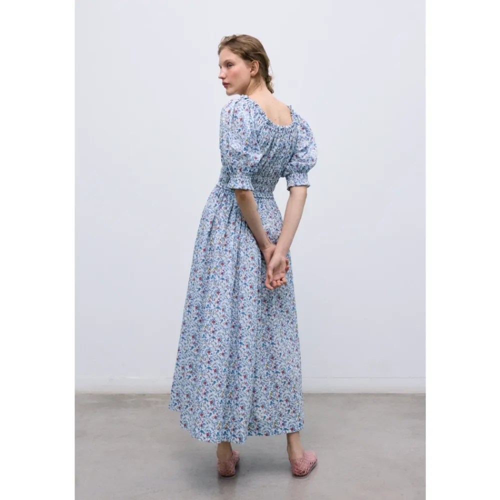 The New Society Cloe Dress er en maxi bomuldskjole, der defineres af et elastisk brystparti med bindebånd og voluminøse, rynkede ærmer. Den tilbyder et legende, men elegant look til dags- og afslappede lejligheder. Vigtige egenskaber: Blå | Bomuld | Elastisk brystparti med bindebånd | Elastiske ærmekanter | Voluminøse ærmer med flæsekant | Bindebåndsdetalje foran | Maxi længde | Sammensætning & pleje: 100% Bomuld