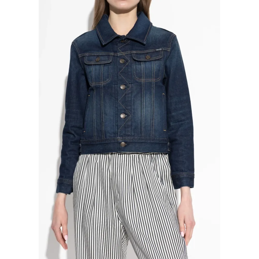Tom Ford Denimjakke fortolker den klassiske trucker-silhuet med et skræddersyet, taljekort snit og signatur-brandede hardware. Stykket kombinerer en struktureret denimkonstruktion med subtile detaljer for et raffineret, minimalistisk garderobeelement. Vigtige egenskaber: Navy blå | Denim | Struktureret konstruktion | Holdbart stof | Påsyede brystlommer med klap | Sidelommer | Knaplukning foran | Knapmanchetter | Trucker-inspireret silhuet | Taljekort snit | Kontrastsyninger | Brandede metalknapper | Mål og pasform: Modelhøjde: 177 cm | Buste: 83 cm | Talje: 61 cm | Hofter: 89 cm | Skræddersyet pasform | Taljekort snit | Modellen er iført størrelse S | Sammensætning og pleje: 98% bomuld | 2% polyurethan