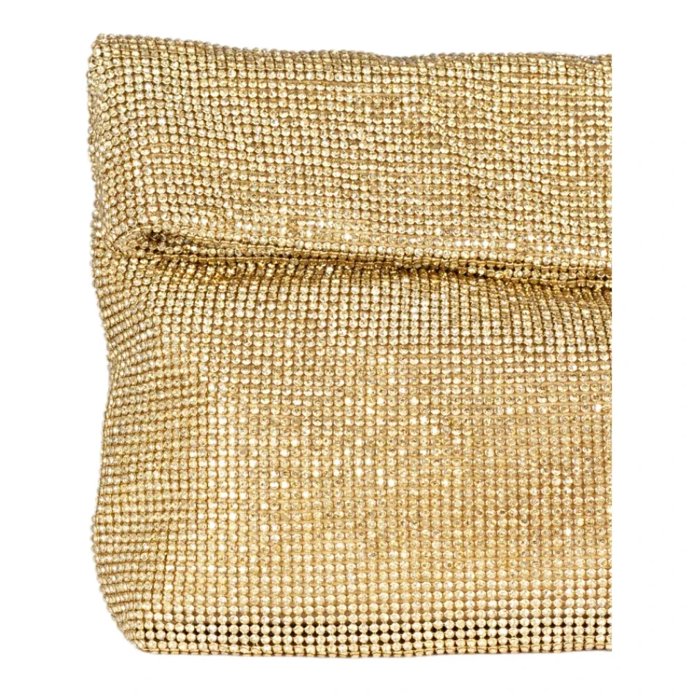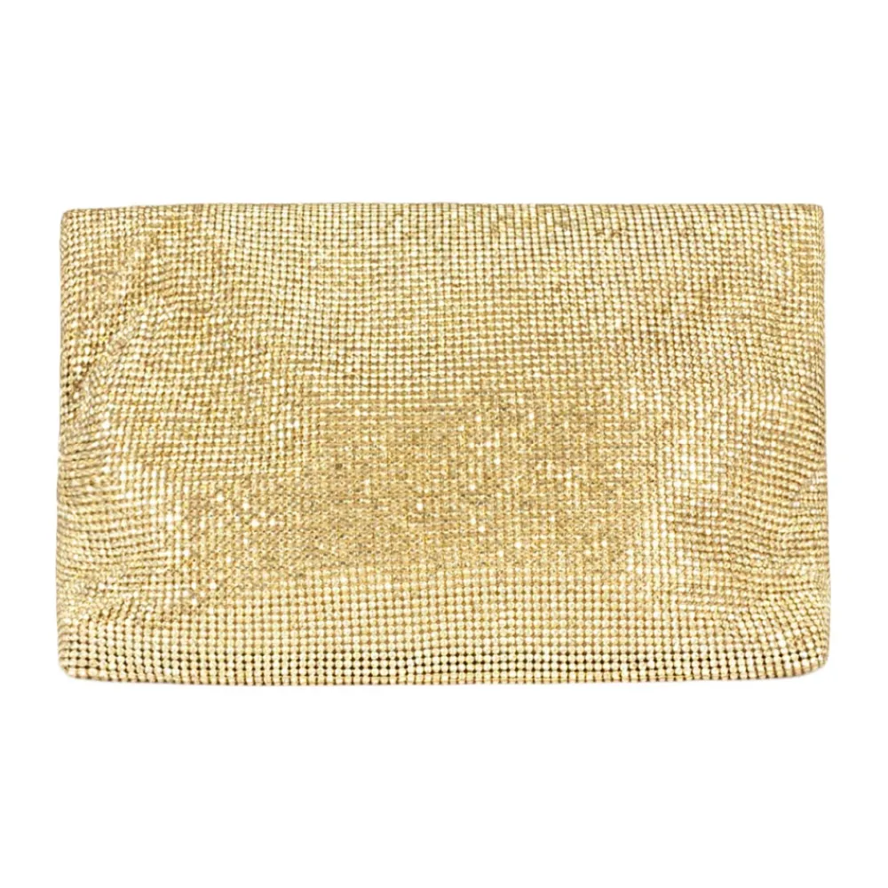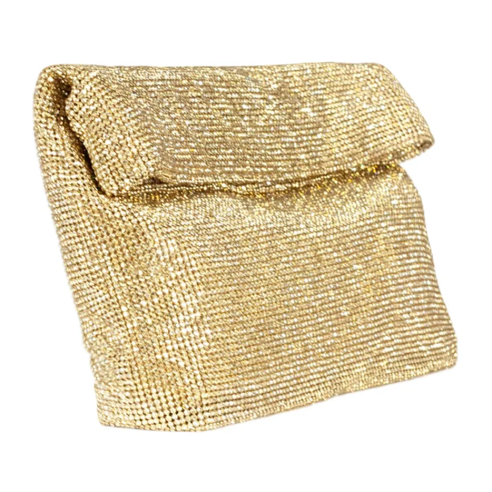 Twentyfourhaitch Varadero Mini Clutch Taske kombinerer et rhinstensstrikket ydre med en magnetisk lukning for kompakt aftenbrug. Mini-silhuetten er designet til essentielle ting og en poleret, funklende finish. Nøgleattributter: Gul | Gylden | Rhinstensstrik | Magnetisk lukning | Rhinstensstrikket overflade | Mini clutch-silhuet | Dimensioner og pasform: B25 x H15 x D5 cm | Sammensætning og pleje: Rhinstensstrik
