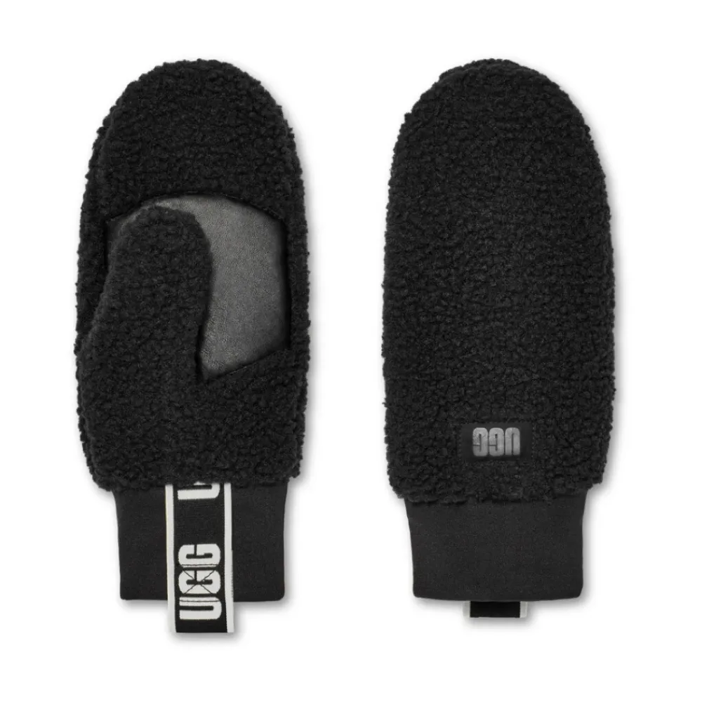 UGG Fluff Mitten With Logo Tape kombinerer blød sherpa-isolering med en forstærket læderhåndflade til hverdagsbrug i koldt vejr. Designet til nemt at tage af og på, og kombinerer fluffy varme med logo-detaljer. Vigtigste egenskaber: Sort | Sherpa | Isoleret faux-fur foring | Varm fleecekonstruktion | Strækbare stormmanchetter | Brandede trækstropper for nem af- og påtagning | Læderhåndflade for greb og forstærkning | Vante silhuet | Fluffy sherpa ydre | Læder logo patch | Logo tape detalje | Dimensioner og pasform: Fås i S/M og L/XL | Sammensætning og pleje: Akryl | Modakryl | Polyester sherpa | Faux fur foring (polyester) | Læder (logo og håndflade) | Pletrens stoffet; professionel læderrens til læderdele.