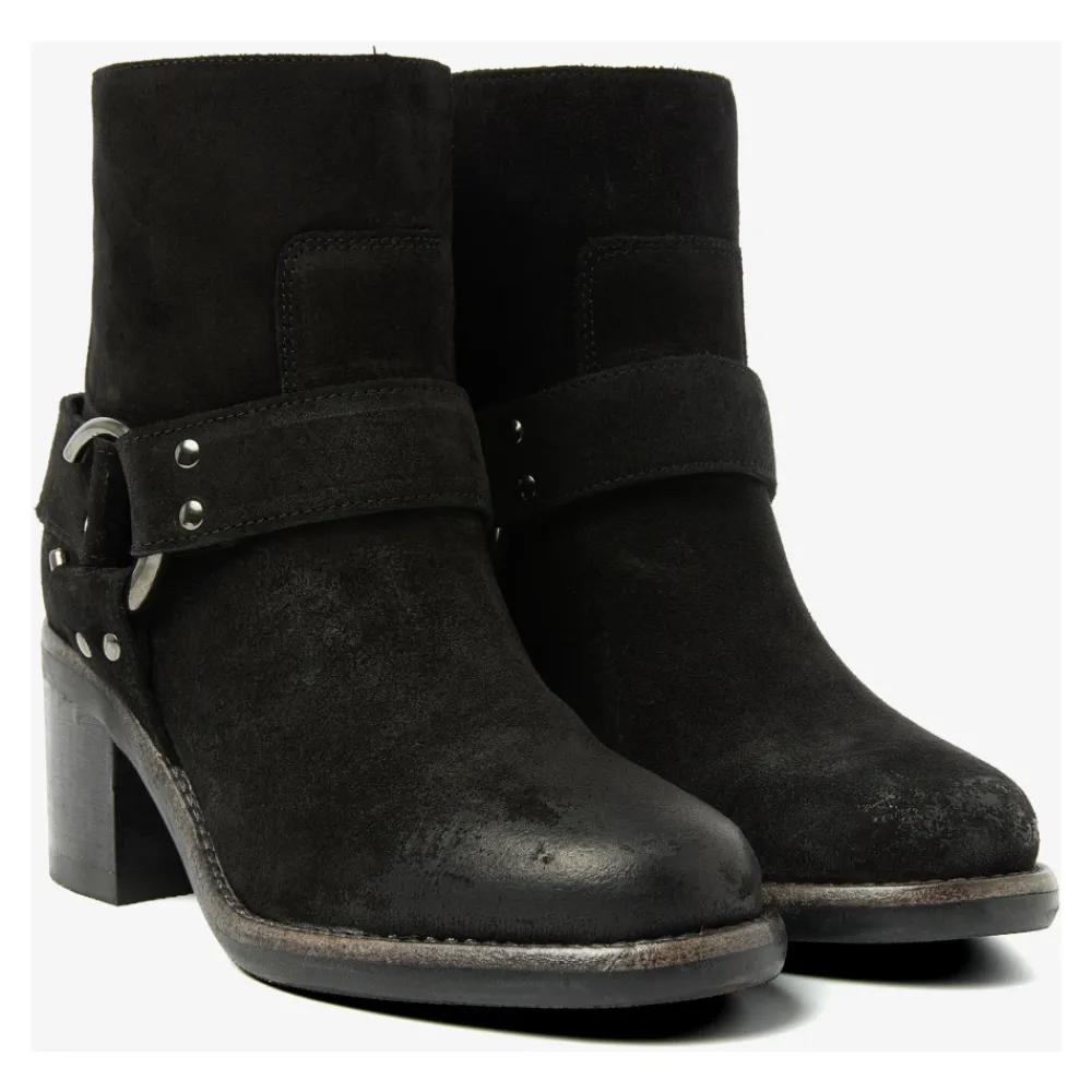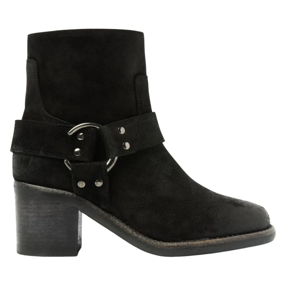 Nøglefunktioner Subtil blokhæl Metalring Funktionel lynlås på indersiden Lærfór Lavet af høj kvalitet ruskind Håndlavet i PortugalFlo Baker sorte ankelstøvlerStatement piece alert.Leder du efter den perfekte ankelstøvle med et sejt twist? Så er du heldig med Flo Baker! Disse sorte ankelstøvler er lavet af høj kvalitet ruskind og har en sej spænde for et edgy western touch. Flo Baker har en subtil blokhæl, der giver dig lidt ekstra længde uden at gå på kompromis med komfort.Flo Baker ankelstøvler kombinationKombiner disse støvler med beskårne læderbukser og en chic bluse for at skabe en flot stil kontrast. Eller bær støvlerne på sommerdage med denimshorts eller en flowy kjole for et sejt look. Med Flo Baker vil du gøre en modeerklæring uanset hvad.