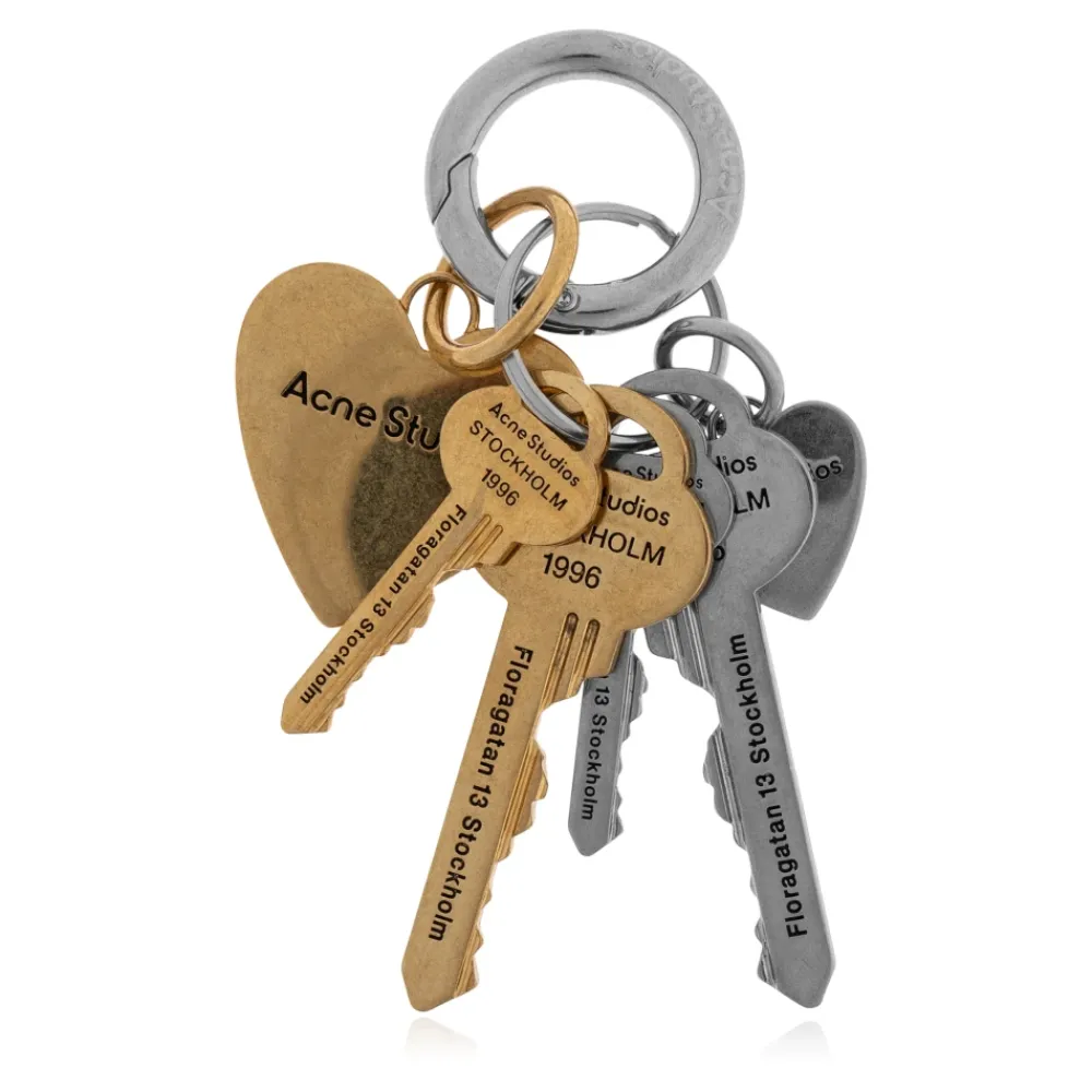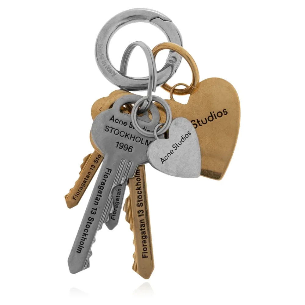 Acne Studios Nøglering kombinerer aflange nøgler og hjerteformede charms i en halvmat guld- og sølvfinish, hvilket skaber et skulpturelt tilbehør med et præcist indgraveret logo. Nøgleattributter: Guld | Sølv | Messing | Holdbar metalkonstruktion | Flere charm-vedhæftninger | Splitring til nøgler eller taske-charm | Alsidig brug som nøglering eller tilbehør | Hjerte- og nøgle-charms | Indgraveret Acne Studios logo | Halvmat guld- og sølvfinish | Skandinavisk minimalistisk detaljering | Dimensioner og pasform: Total længde: 90 mm | One size | Sammensætning og pleje: Skal: 100% Messing | Kontrast: 100% Zamak | Kontrast: 100% Jern