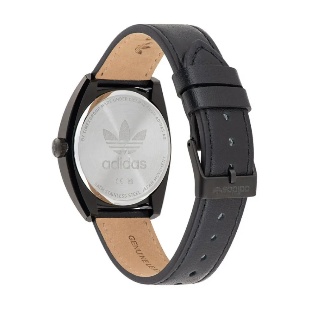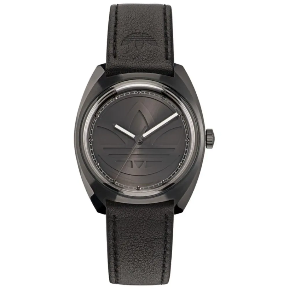 Adidas Uret kombinerer en 39 mm sort urskive med et læderetui og en rem til hverdagsbrug. Det har et quartz urværk og mineralglas med 5 ATM vandbeskyttelse. Nøgleattributter: Sort | Læder | Vandafvisende til 5 ATM | Quartz urværk | Analog display | Spænde lukning | Læderetui og armbånd | Sort urskive | Mineralglas | Dimensioner og pasform: Urskive diameter: 39 mm | Sammensætning og pleje: Læder