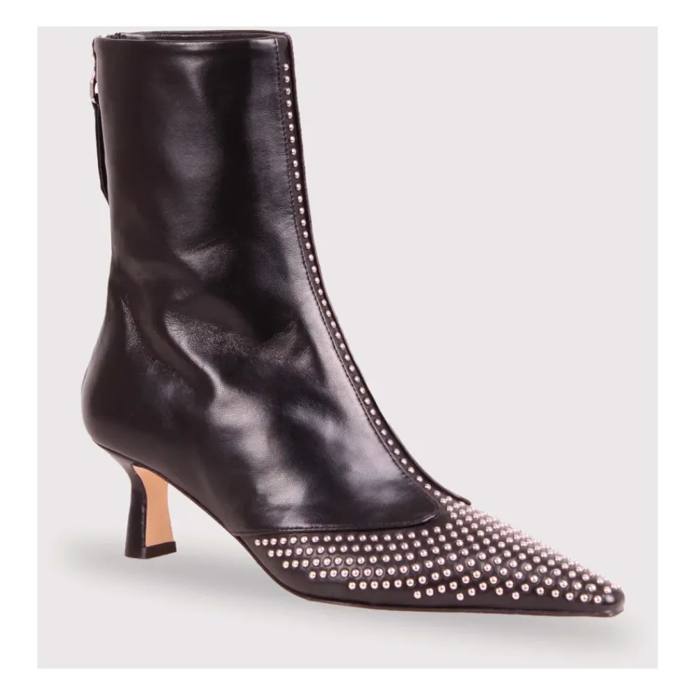 AEYDE Sila ankelstøvler tilfører et markant, nittebesat T-bar-silhuet til looks til særlige lejligheder. Den spidse tå og den lave kitten-hæl giver en raffineret og iøjnefaldende finish. Vigtige egenskaber: Sort | Læder | Lynlåslukning bagpå | Spids tå | T-bar-detalje med nitter | Kitten-hæl | Dimensioner og pasform: Passer normalt i størrelsen (italiensk størrelse) | Sammensætning og pleje: Overdel: Læder | Foring: Kornet lammeskind | Sål: Læder | Gummi