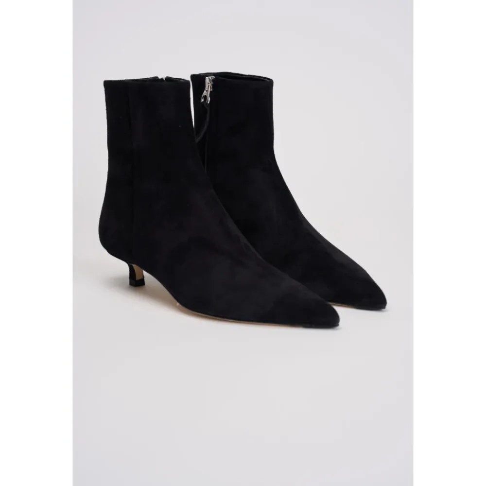 Aeyde Sofie Suede Ankelstøvler kombinerer en elegant, spids tå med en lav, behagelig kittenhæl for en sofistikeret hverdags silhuet. Designet balancerer raffineret form og nem anvendelighed til outfits, der spænder fra jeans til skræddersyede stykker. Vigtige egenskaber: Sort | Ko-ruskindslæder | Indvendig lynlåslukning | Polstret lammeskindsindersål | Dækket hæl med gummiindsprøjtning | Spids tå | Ankelhøjt skaft | Kittenhæl (lav, tilspidset profil) | Elegant, strømlinet silhuet | Mål og pasform: Hælhøjde: 3,5 cm | Skafthøjde: 15,5 cm | Lægomkreds: 26 cm | Sammensætning og pleje: Udvendigt: 100% Ko-ruskindslæder | Indvendigt: 100% Krydsningslammelæder | Ydersål: 90% Læder, 10% Gummi