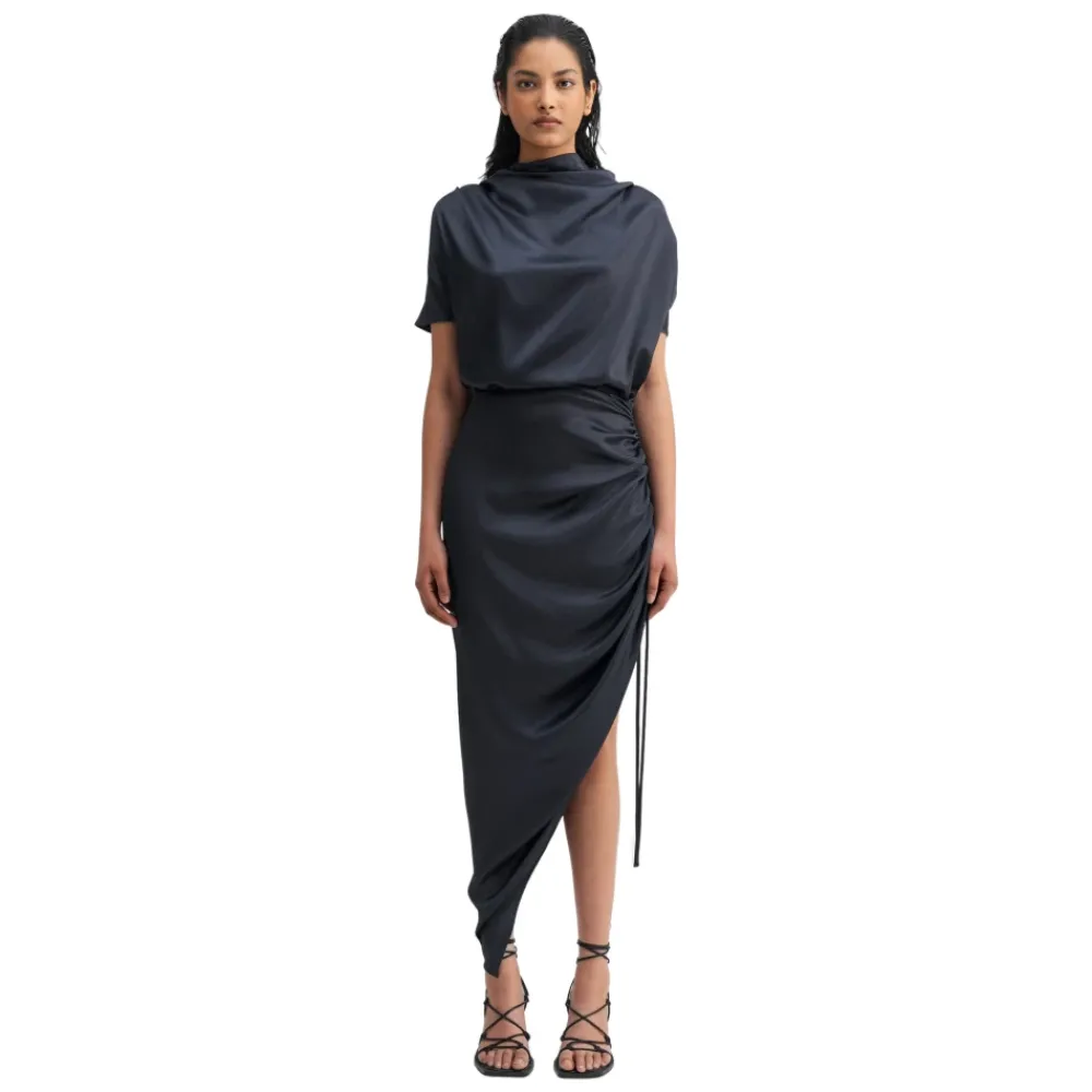Haleys kjole er skåret i en acetatblanding med en satinoverflade. Den har folder til drapering langs skuldrene, korte ærmer og en skjult lynlås i nakken bagpå. Nederdelen indeholder en justerbar snøre, som giver en asymmetrisk effekt med drapering. Den perfekte kjole til alle former for fejringer. • Pasform: Normal i størrelsen. Vai er 172 cm høj og bruger størrelse S. • Kvalitet: 85% acetat, 15% polyester – satin • Vedligeholdelsesinstruktioner: Håndvask. Må ikke tørretumbles. Stryges ved svag varme. • Vidste du, at du kan afhente din ordre gratis i vores showroom, Rådmansgatan 35, i Stockholm? Vi sender dig en e-mail, når den er klar, typisk inden for 24 timer.