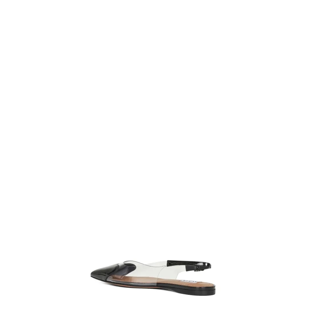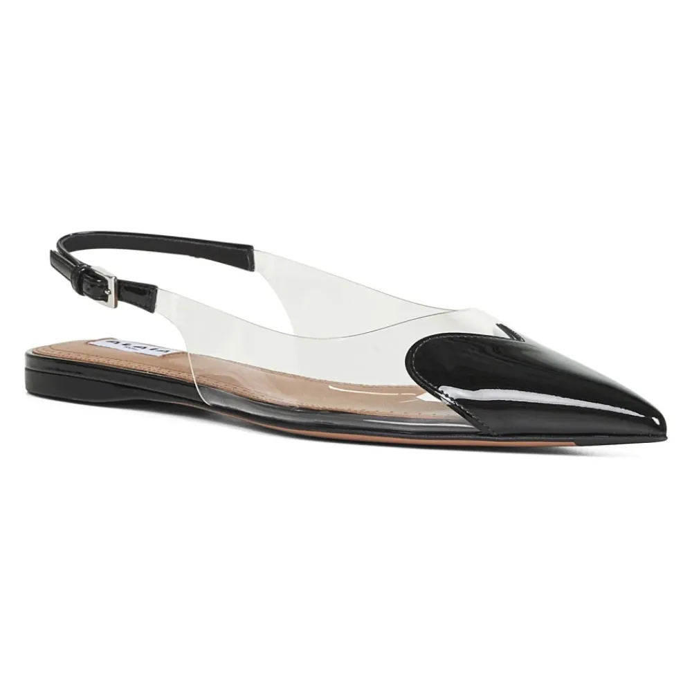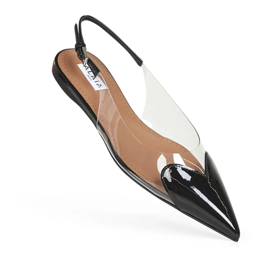 Alaïa Sandaler — Sandaler med en transparent PVC-overdel og en sort, patentlæder hjerteindsats, der kombinerer skulpturelle detaljer med en spids flad tå. En justerbar ankelrem i patentlæder og læder indersål gør dem velegnede til raffineret hverdags- eller aftenbrug. Vigtigste egenskaber: Sort | Kalvelæder | Gummiindsats på sålen for ekstra greb | Justerbar sort ankelrem i patentlæder med metalspænde | Læder indersål | Lædersål med gummiindsats | Spids tå | Transparent PVC-overdel med sort hjerteformet indsats i patentlæder foran | Fremstillet i Italien | Dimensioner og pasform: Svarer til IT 38 størrelse | Sammensætning og pleje: 100% Kalvelæder | Stof II: 100% Polyurethan