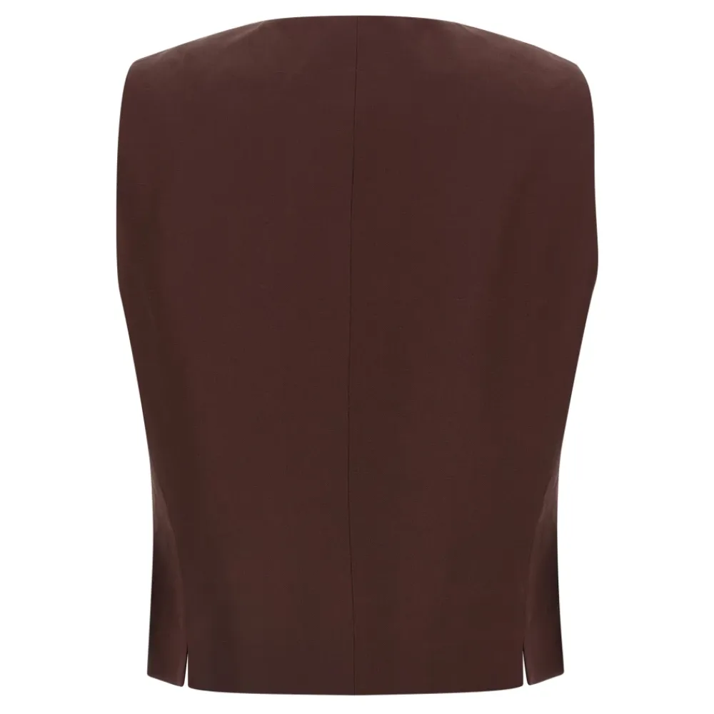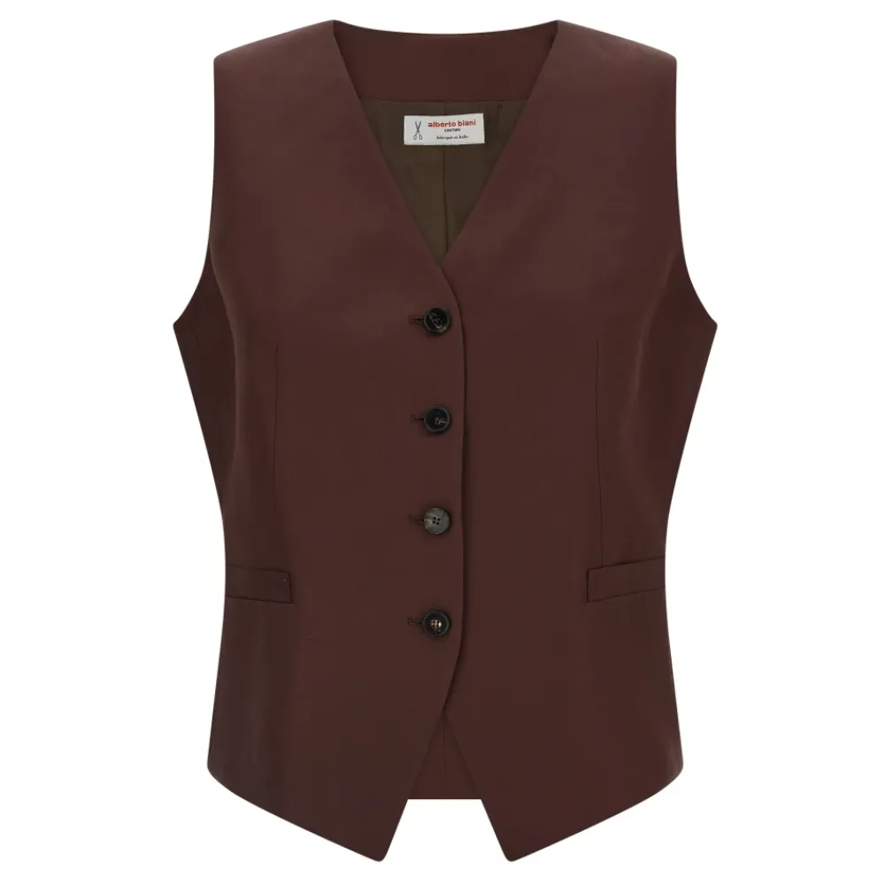 Alberto Biani viskose- og linnedvest – et let skræddersyet lag med V-hals og asymmetrisk kant, ideel til smarte hverdagslooks og lag-på-lag-looks. Vigtigste egenskaber: Brun | Viskose og linned | Knaplukning foran | Påsyede lommer | Foret | V-hals | Asymmetrisk kant | Uden ærmer | Mål og pasform: Normal pasform | Sammensætning og pleje: Viskose | Linned