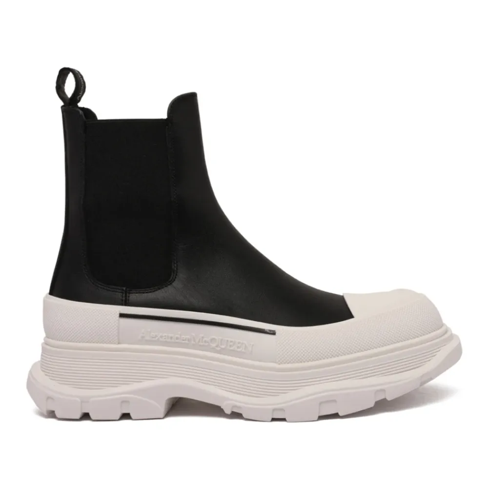 Forkæl dig selv med disse Alexander McQueen Black Chelsea Tread støvler. Lavet af sort læder med en hvid tyk gummisål, rund tå, træktab bagpå, elastiske sider og slip-on stil, disse støvler er et must-have for den modebevidste kvinde.