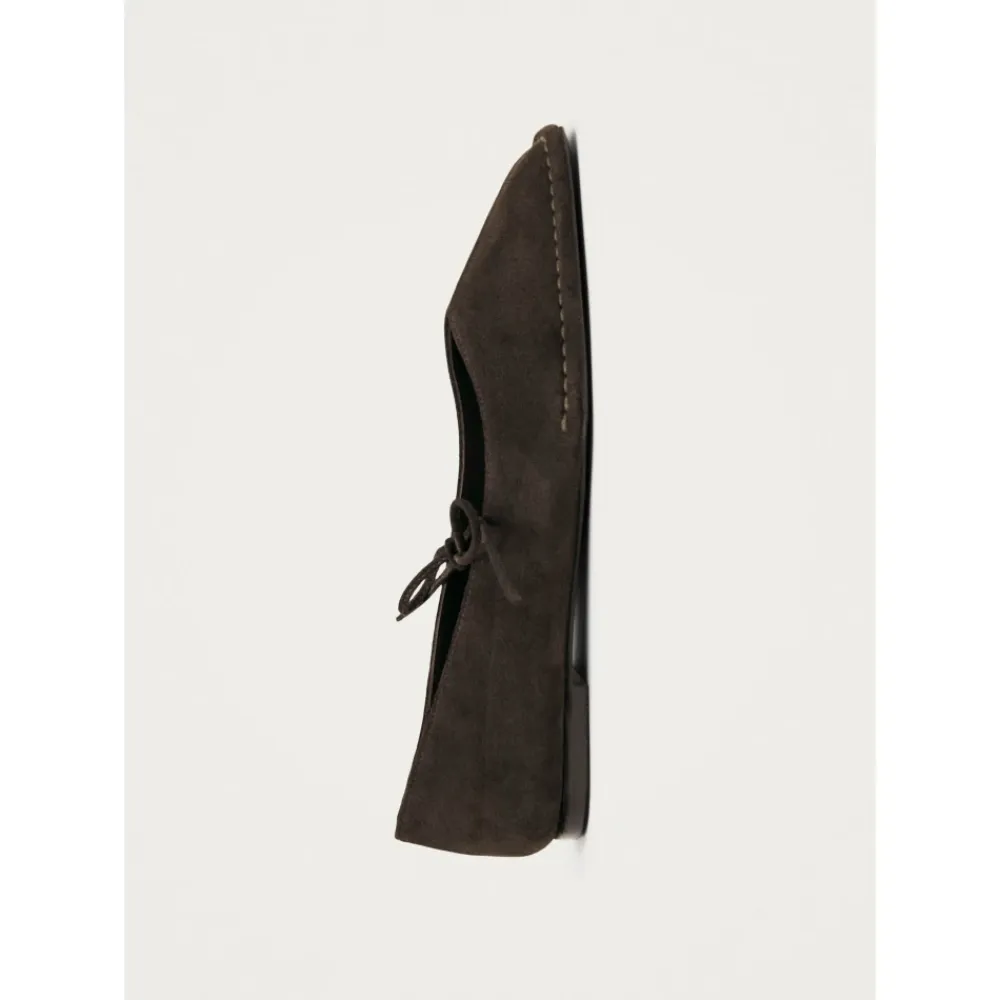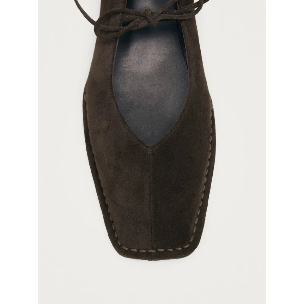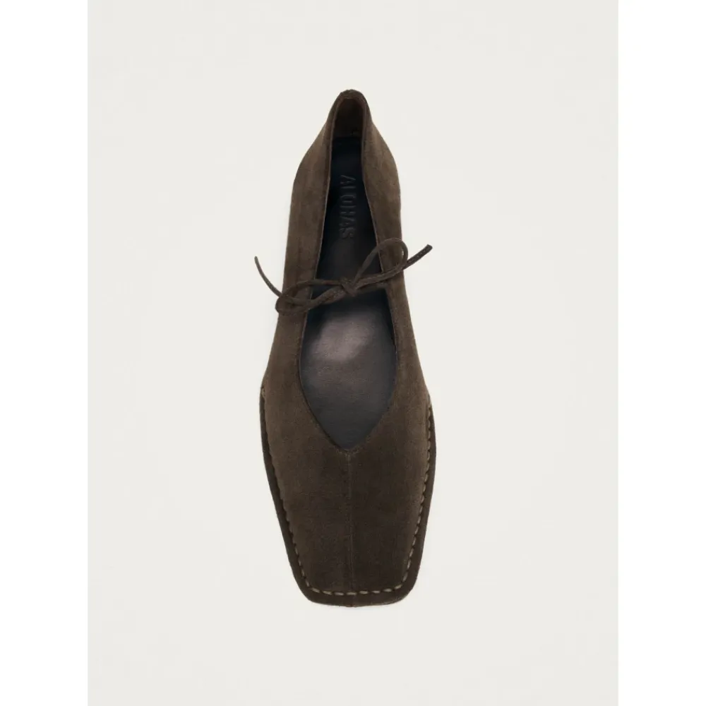 ALOHAS Sway Ballerina Sko opdaterer en klassisk ballerinaform med en firkantet tå og V-formet vrist i kaffebrun ruskind, hvilket giver en raffineret og alsidig mulighed til hverdagsbrug. Vigtigste egenskaber: Brun | Ruskind | Bindelukning | Slip-on | Firkantet tå | V-formet vrist | Sløjfe ved vristen | Lav hæl | Dimensioner og pasform: Hælhøjde: 1 cm | Passer normalt i størrelsen. Hvis du er mellem størrelser, skal du vælge den mindre størrelse. | Sammensætning og pleje: Overdel: 100% Ko Ruskind | Foring, Indersål: 100% Gede Læder | Ydersål: 100% Cuerolite