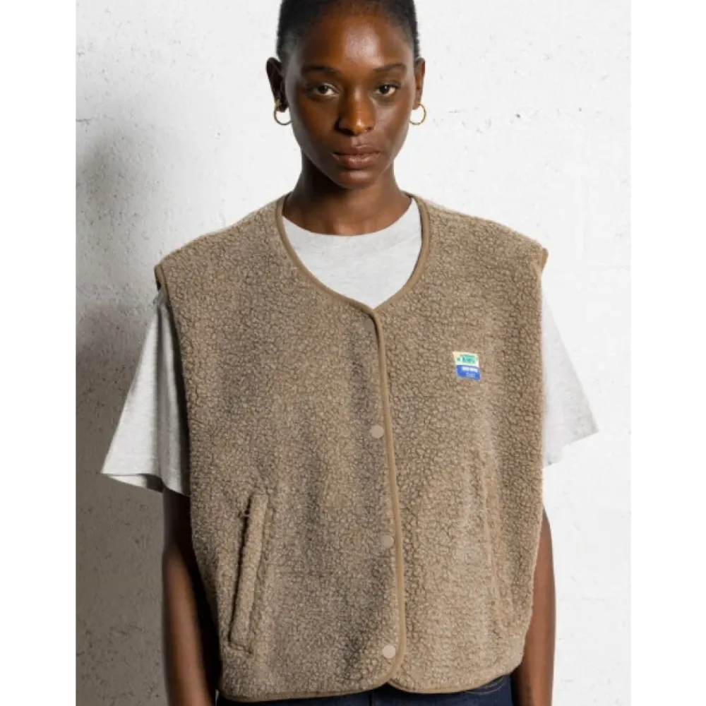 American Vintage ærmeløs vest i muscade chine brun, med et lige, minimalistisk snit med en trykknaplukning og lynlåslommer foran for nem lag-på-lag-påklædning i mellemsæsonen. Vigtigste egenskaber: Brun | Muscade chine | Polyester | Fleeceforet for komfort | Trykknaplukning | Lynlåslommer foran | Rund halsudskæring | Ærmeløs | Lige snit | Mål og pasform: Ryglængde: 56 cm | Stor i størrelsen – overvej at vælge en størrelse mindre end din sædvanlige størrelse | Sammensætning og pleje: 100% Polyester