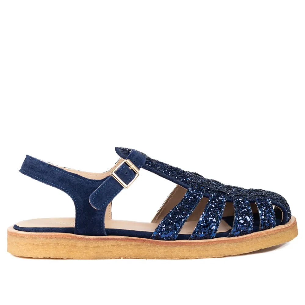 Oplev elegancen ved den blå glitter sandal med ankelrem fra Angulus, med et fantastisk midnatsblåt glitterdesign, der er perfekt til enhver lejlighed. Produkt detaljer: Midnatsblå | Blå | Læder | Justerbar lukning med guldfarvet spænde | Rund snude | Åben hæl | Fletning | Ankelrem | Dimensioner og pasform: Normal pasform – medium bredde | Sammensætning og pleje: Læder | Læderforing | Rå gummisål