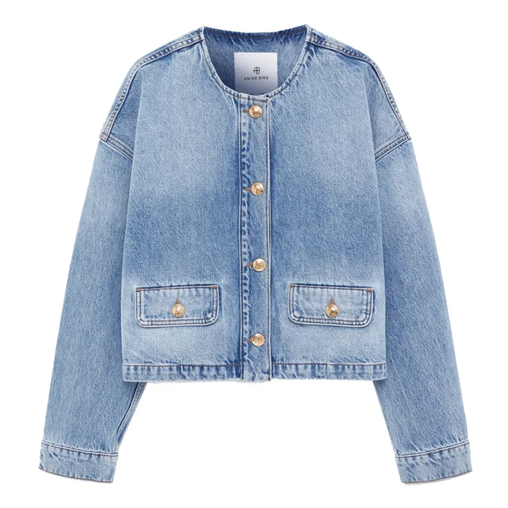 Anine Bing denimjakke i blå | lyseblå. En alsidig denimjakke til hverdagsstyling og nem lagdeling. Vigtige egenskaber: Blå | lyseblå