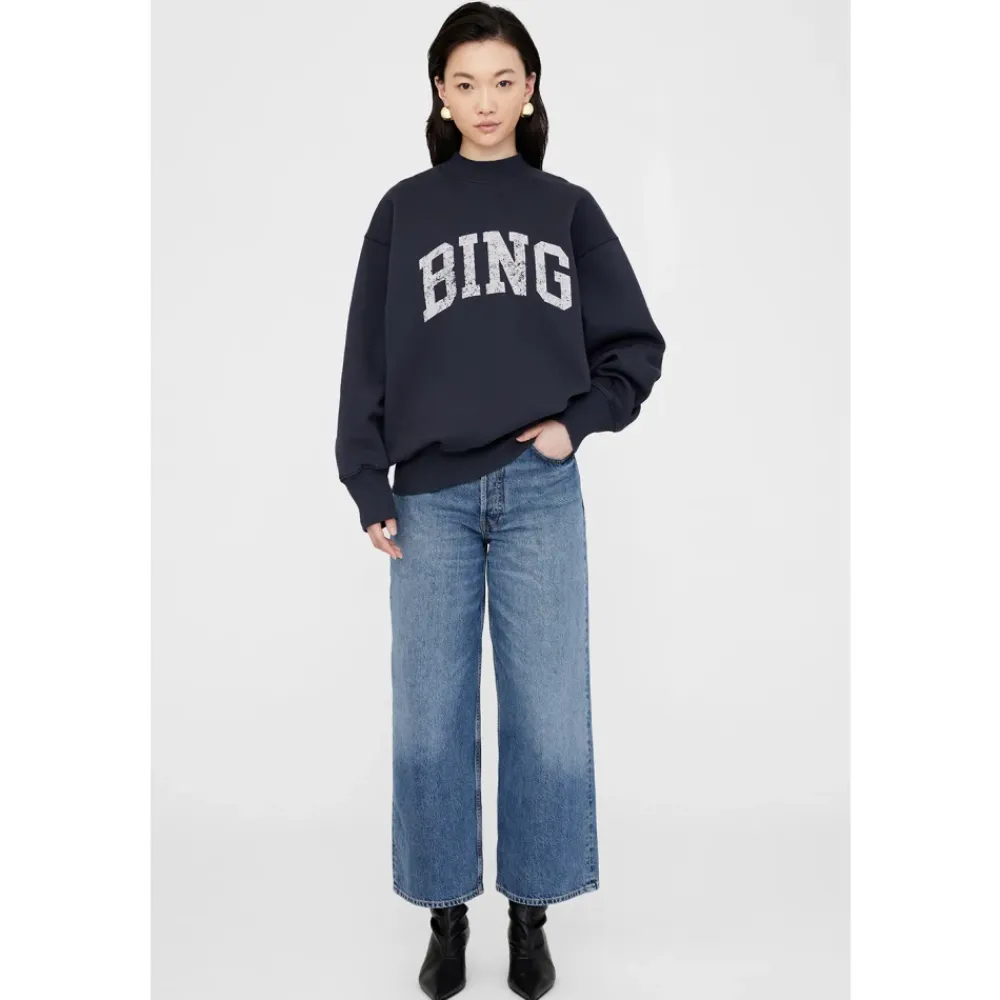 Anine Bing Bradie Sweatshirt tilbyder en perfekt blanding af afslappet komfort og elegant design, med en markant Bing grafik, der skiller sig ud mod den marineblå baggrund. Produkt detaljer: Navy | Blå | Bomuldsfleece | Høj mock neck | Lange ballonærmer | Ribkant | Dimensioner og pasform: Afslappet pasform | Gå en størrelse ned for en mere tætsiddende pasform | Sammensætning og pleje: 85% Bomuld | 15% Polyester | Maskinvaskbar