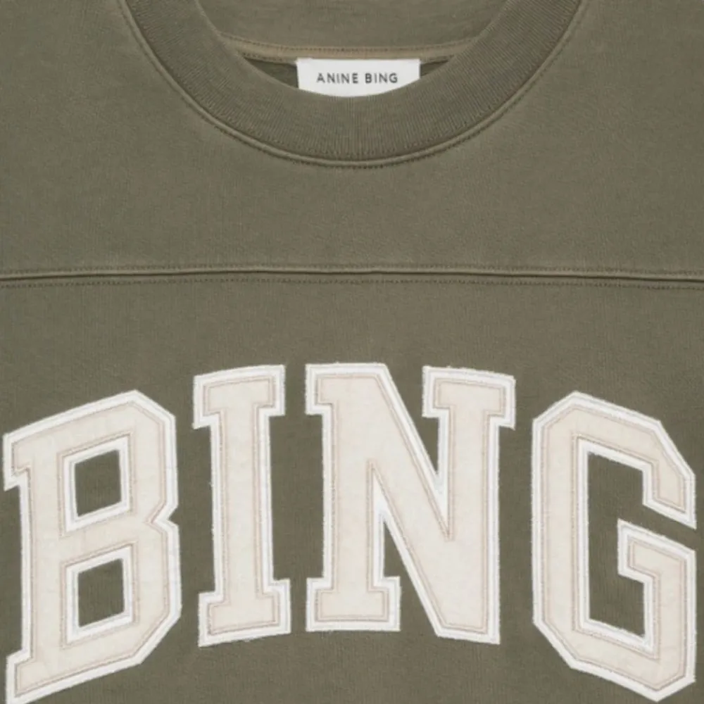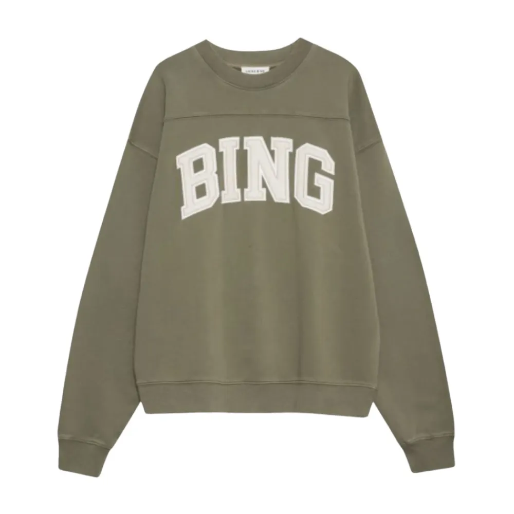 Anine Bing Trenton Sweatshirt er en college-inspireret trøje med et markant BING-logo på forsiden. Den tilbyder et afslappet hverdagslook med klassiske ribkanter. Vigtige egenskaber: Green | Grøn | Bomuld | College-look med fremtrædende BING-logo | Rund hals | Ribstrikkede manchetter og søm | Vasket finish | Mål & pasform: Let oversized pasform | Materiale & pleje: 100% bomuld | Maskinvask ved 30°C på et skåneprogram.