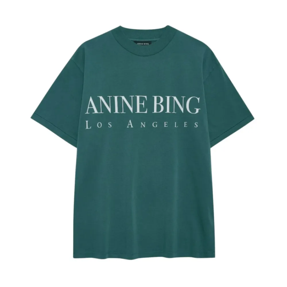 Anine Bing ASHTON T-shirt er en mørkegrøn bomulds T-shirt med et kontrasterende Anine Bing Los Angeles print. Den er designet til afslappet hverdagsbrug med en løs, boxy silhuet. Nøgleattributter: Mørkegrøn | Bomuld | Rund halsudskæring | Kontrasterende Anine Bing Los Angeles print | Boxy løs silhuet | Dimensioner og pasform: Boxy løs pasform | Vist størrelse: S | Sammensætning og pleje: 100% bomuld
