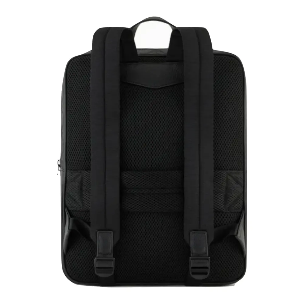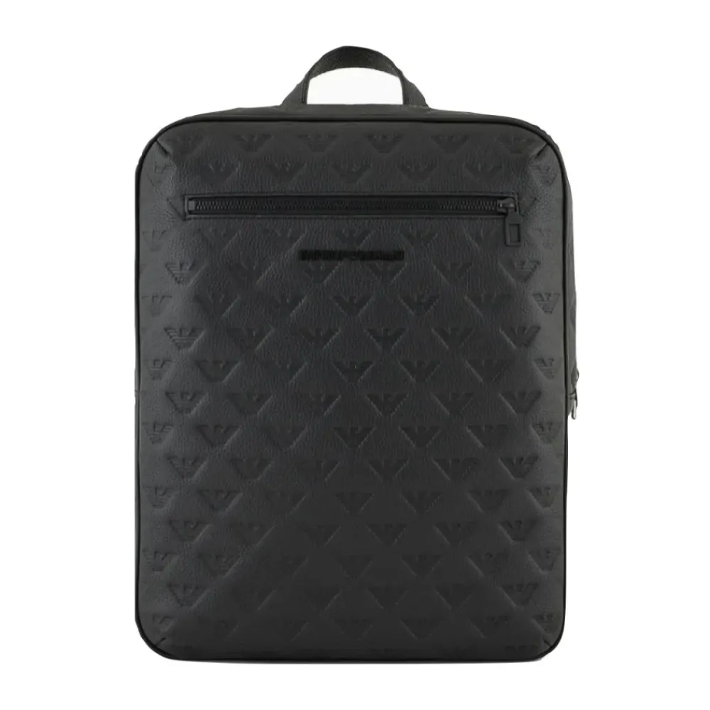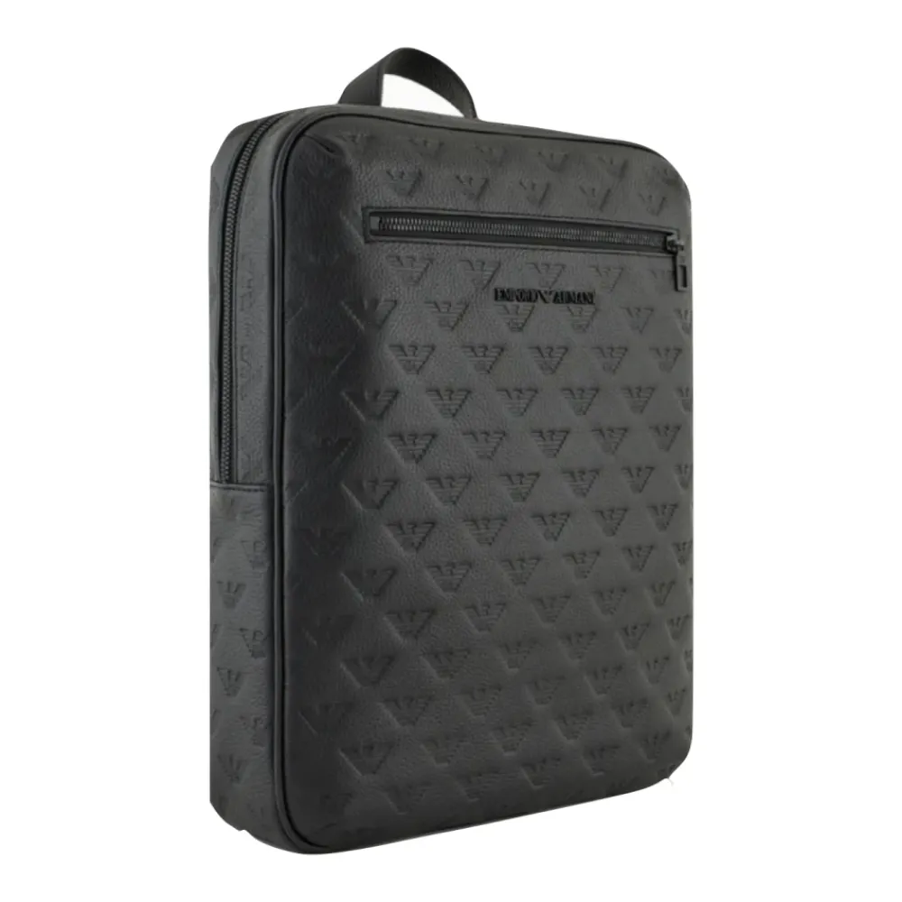 Armani slank læderrygsæk med intern lomme til bærbar computer, justerbare skulderstropper og åndbar mesh-rygpanel. Et dristigt design med sort granada læder med overalt ørneprint og ton sur ton metallogo bogstaver. Lavet af 100% oksekød læder. Mål: 29 x 37 x 6 cm. Funktioner ørneprægning, metallogo, topgreb, lynlåslukning, ekstern lynlåslomme, justerbare skulderstropper, åndbart mesh-rygpanel og trolleyrem.