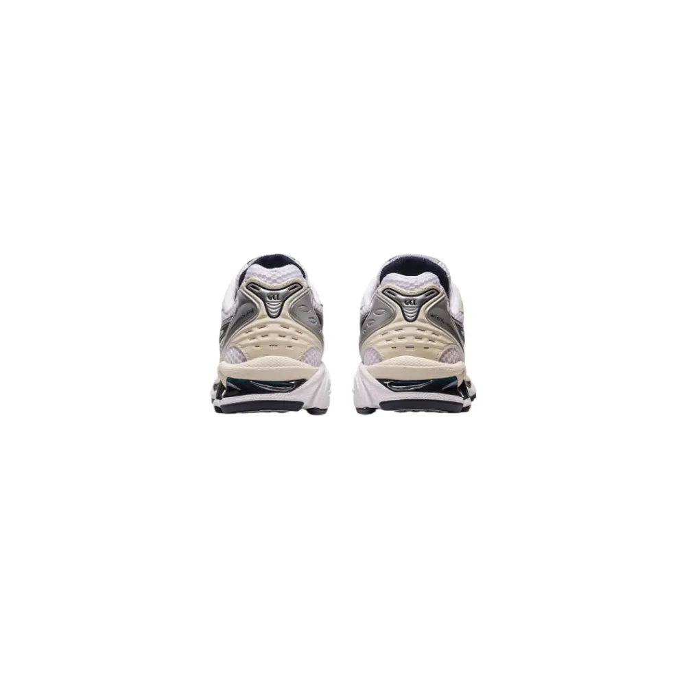 Opdag Asics Gel-Kayano 14 sneakers til kvinder, med stofoverdel med gummi- og tekniske stofindsatser, side logo, stofsnørebånd, Gel-støddæmpende mellemsål, i hvid midnatsfarve.