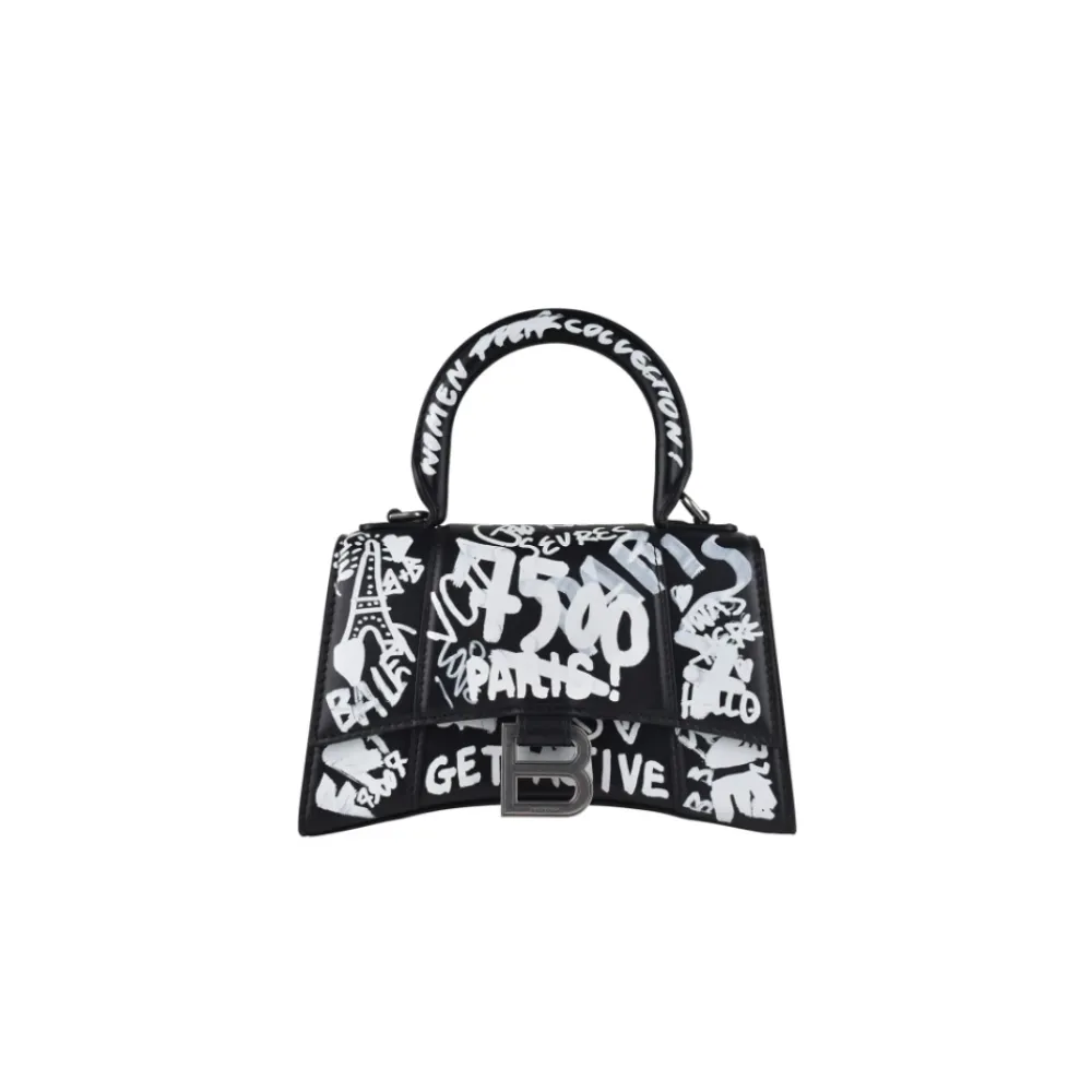 Balenciaga Hourglass XS Graphity Taske kombinerer en skulpturel timeglas silhuet med et markant, heldækkende hvidt graphity print på sort læder. Denne kompakte mini taske er designet til håndfrie dage og polerede aftenlooks. Nøgleattributter: Sort | Læder | Aftagelig, justerbar skulderrem | Frontklap med tryklukning | Stort bærehåndtag | Graphity print overalt | Graveret B logo i metal på fronten | Halvrundt tophåndtag | Dimensioner & pasform: 19 cm x 13 cm x 8 cm | Lille størrelse | Sammensætning & pleje: Læder | Metal