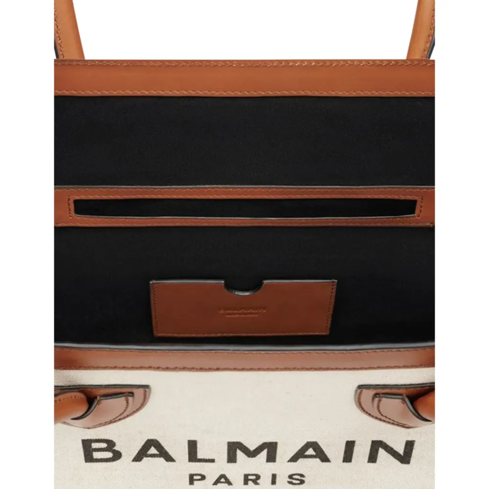 Balmain B-Army 42 Canvas Tote Bag kombinerer en rummelig, struktureret tote-silhuet med kalveskindslæderdetaljer til hverdagsbrug. Designet afbalancerer slidstærk canvas-konstruktion med polerede læderaccenter og en brandet finish. Nøgleattributter: Beige | Kalveskind og bomuld | Struktureret, holdbar konstruktion | Beskyttende støvpose inkluderet | Læderhåndtag | Indvendig paspoleret lomme | Aftagelig indvendig pose/beskyttelsescover | Læderposefødder | Læderpaneler og -indsatser | Trykt Balmain Paris logo | Gyldent hardware | Tote-silhuet med forstærket bund | Mål og pasform: 42 x 34 x 13 cm | One size | Sammensætning og pleje: Bomuld | Linned | Kalveskind