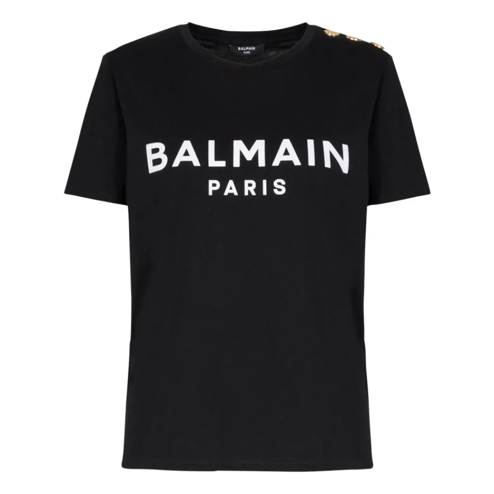 Bomuld T-shirt med Balmain-logo tryk Korte ærmer Rund hals Guldprægede knapper på skulderen Afslappet pasform Denne vare er tro mod størrelsen (vælg din sædvanlige størrelse) Modellen har en størrelse S Modellens højde er 178 cm Hovedmateriale: 100% bomuld Lavet i Portugal Vare: BF1EF005BB02 100% af bomuldsfibrene, der er brugt til at lave dette tøj, er dyrket og GOTS-certificeret