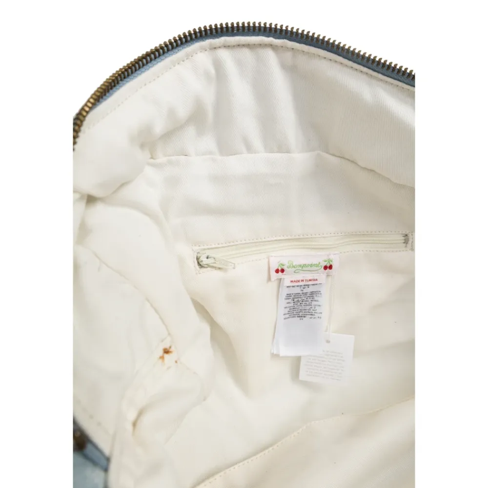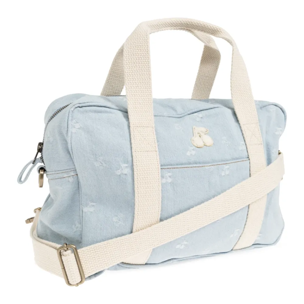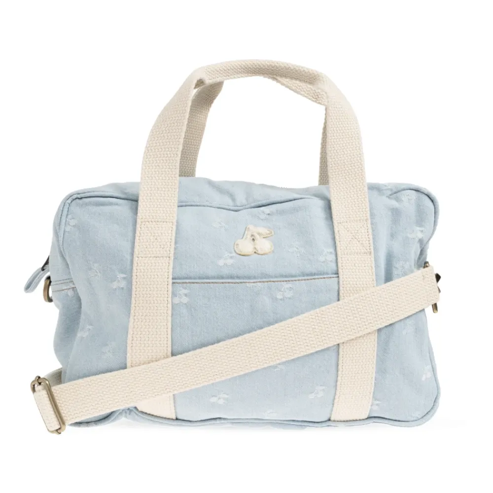 Bonpoint Gigia Travel Bag kombinerer franskproducerede detaljer med praktisk hverdagsbrug. Det lyseblå bomuldsmateriale, det hvide kirsebærmotiv og den justerbare cremefarvede skulderrem gør den til en stilfuld og let transportabel rejsekammerat. Vigtigste egenskaber: Blå | Lyseblå | Bomuld | Holdbar konstruktion | To tophåndtag | Justerbar bred skulderrem | Blødt cremefarvet indvendigt for | Rektangulær form med let afrundede kanter | All-over gentagende hvidt motivmønster | Signatur kirsebærformet mærke | Cremefarvet kontrastskulderrem | Dimensioner og pasform: Højde: 22 cm | Bredde på det bredeste sted: 34 cm | Bundbredde: 11 cm | Sammensætning og pleje: 100% Bomuld