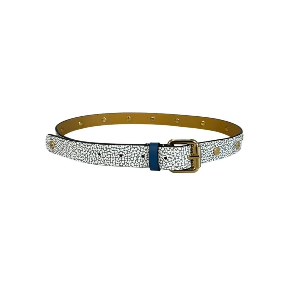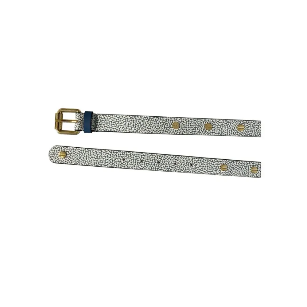 Borbonese bælte med et mikro-prikket print og guldfarvet spænde. Det justerbare, slanke design tilføjer taljedefinition og raffinerede hardware-detaljer. Nøgleattributter: Blå | Polyvinyl | Justerbar pasform | Spænde lukning | Mikro-prikket print | Guldfarvet spænde og hardware | Slank silhuet | Dimensioner og pasform: 100 cm x 2.5 cm | Justerbar pasform | Sammensætning og pleje: 80% Polyvinyl | 20% Polyester | Kant: 100% Læder