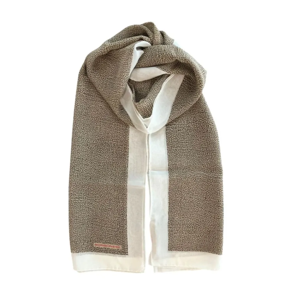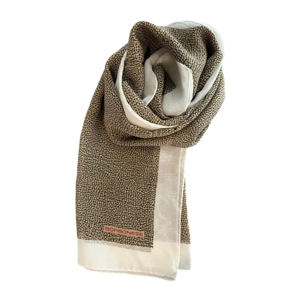 Borbonese præsenterer en silke stole med et elegant mikro-prikket print og kontrasterende, skinnende hvide kanter, der tilføjer raffineret visuel interesse til ethvert outfit. Vigtige egenskaber: Hvid | Silke | Mikro-prikket print | Kontrasterende skinnende hvide kanter | Subtil logo detalje | Stole silhuet | Mål og pasform: 65 cm x 180 cm | Sammensætning og pleje: 100% Silke