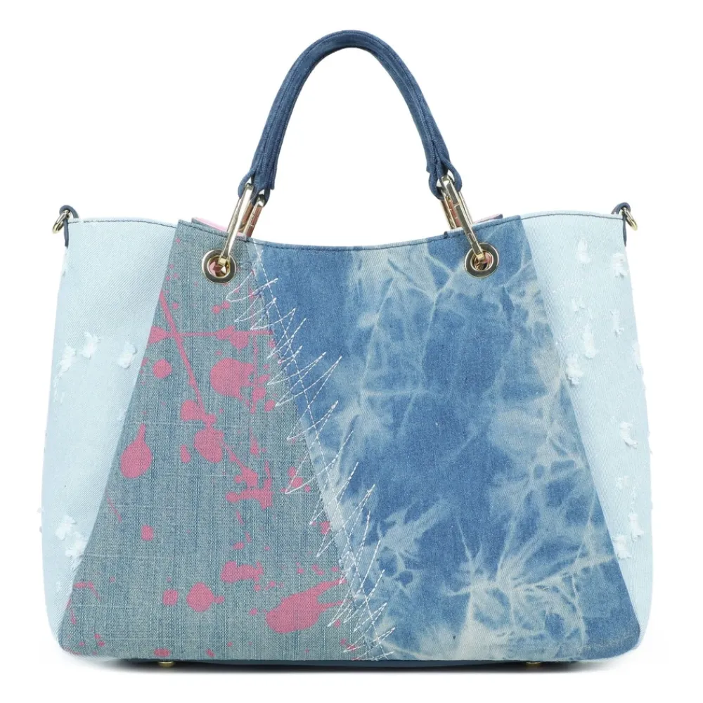 Braccialini Stor Håndtaske kombinerer et patchwork-design i denim med udvidelige sidepaneler, hvilket giver en rummelig og alsidig taske, der passer til hverdagsbrug. Vigtige egenskaber: Multicolor | Blu | Denim | Dobbelte håndtag | Udvidelige sidepaneler skjult i sømmene | Aftagelig indvendig pose | Aftagelig og justerbar logobeklædt skulderrem | Denim patchwork | Farveklat-detaljer | Broderede detaljer | Nittedetaljer | Kontrasterende pink interiør | Guldfarvet metal hardware | Mål og pasform: 36 cm x 29 cm x 17 cm | Alsidig bæring: tophåndtag og aftagelig, justerbar skulderrem | Udvidelige sidepaneler for øget kapacitet