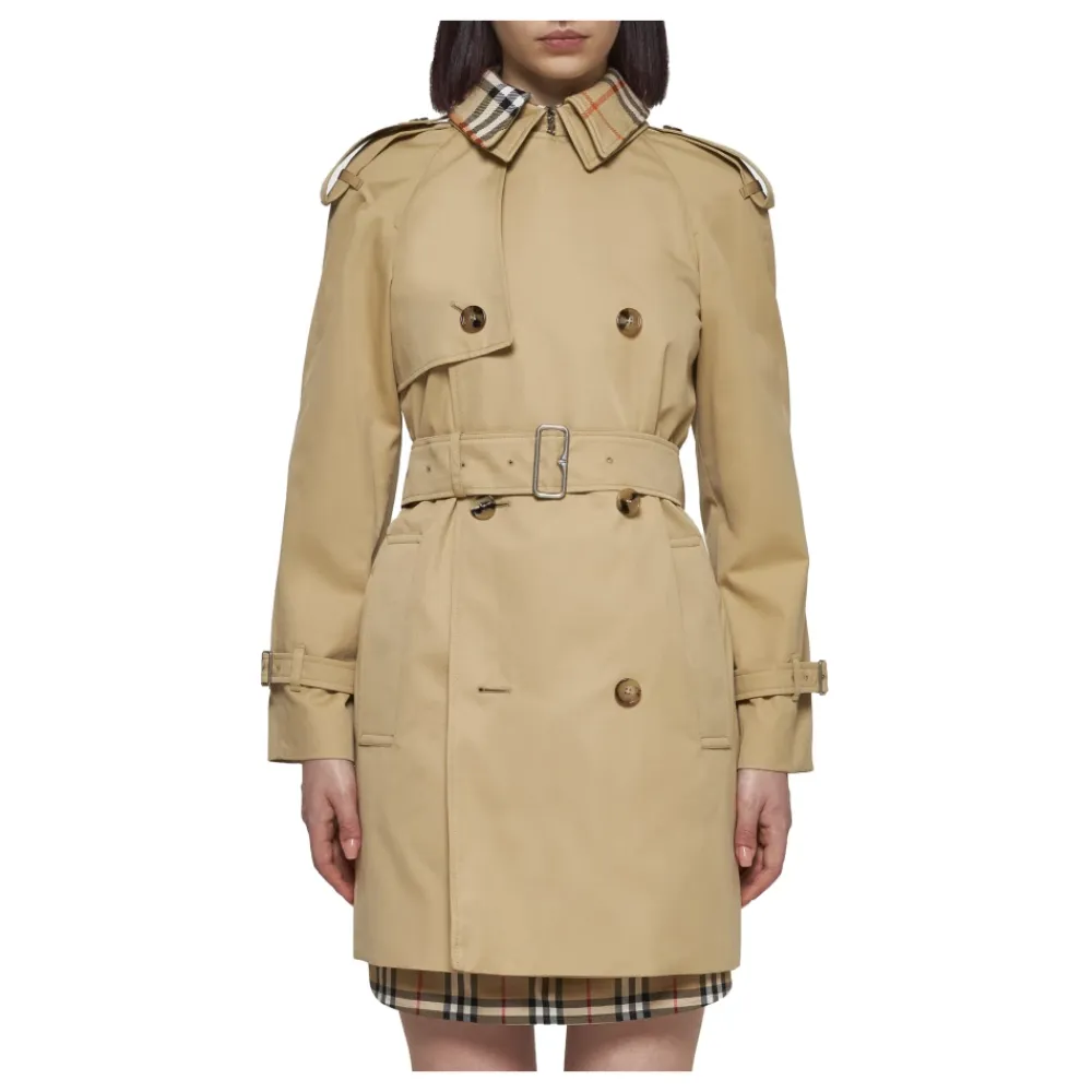 Opgrader din stil med Burberrys korte trenchcoat med ternede detaljer. Dette ikoniske stykke har en karakteristisk ternet jacquardstofkrave og et klassisk dobbeltradet design. Produkt detaljer: Flax | Beige | Bomuldsgabardine | Justerbare stropper med spænde ved manchetter | Sidelommer | Slids bagpå | Hægte-og-malle-spids krave | Knappede skulderstropper | Taljebælte med B-spænde | Signatur ternet printforing | Dimensioner og pasform: Almindelig pasform | Sammensætning og pleje: 100% Bomuld | Renseri kun
