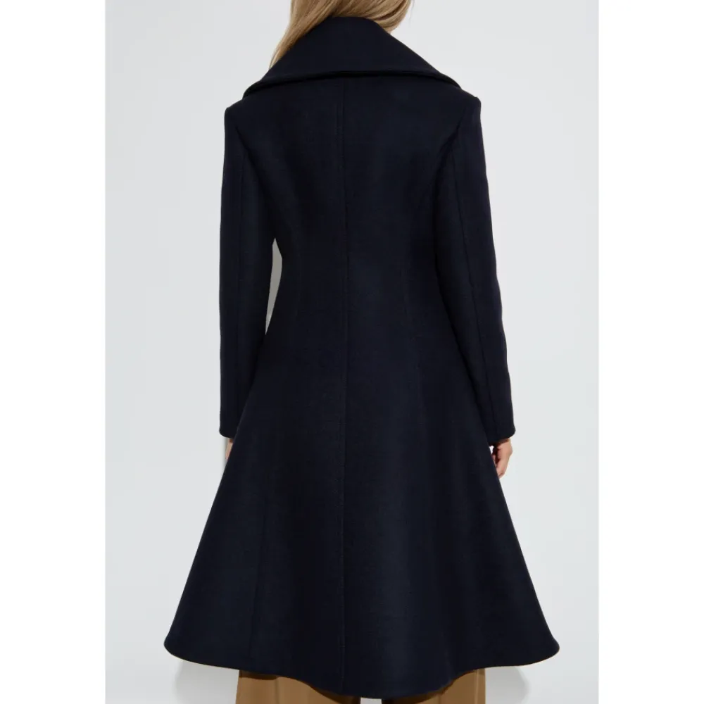 SILVERLAKE-frakken fanger med sin ædle enkelhed og forfinede skrædderkunst og bringer et pust af tidløs elegance til ethvert outfit. Skabt af modehuset BURBERRY fortryller den med en gennemtænkt silhuet: den tilpassede top fremhæver subtilt figuren, mens den svungne ‘fit & flare’ bund tilføjer lethed og ynde til det hele. Den dybe nuance af mørk marine harmonerer med den minimalistiske form og fraværet af unødvendige pynt, hvilket fremhæver frakkens alsidige, sofistikerede karakter. Designet skiller sig ud med en iøjnefaldende bred krave med store slag, der fungerer som en spændende detalje af denne vedvarende klassiker. Lavet af høj kvalitet uld med en mat, blød plysset tekstur og foret med luksuriøst cupro-stof, garanterer den enestående komfort og elegance i mange år fremover. Den dobbeltradede lukning med fire knapper hylder de traditionelle britiske stilarter. HVORFOR KØBE DETTE PRODUKT? * Unik, mesterlig designlinje signeret af Burberry * Eksklusivt materiale – uld og luksuriøst cupro-for * Tidløs, minimalistisk stil egnet til enhver sæson * Iøjnefaldende krave og fejlfri håndværk * Maksimal komfort og vedvarende ædel kvalitet Modelmålinger Højde: 177 cm Buste: 83 cm Talje: 61 cm Hofter: 89 cm Modellen har størrelse: 8