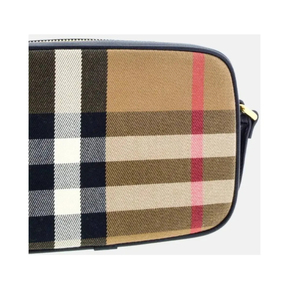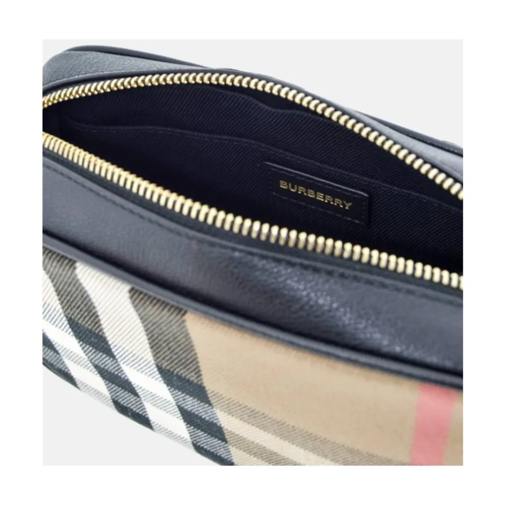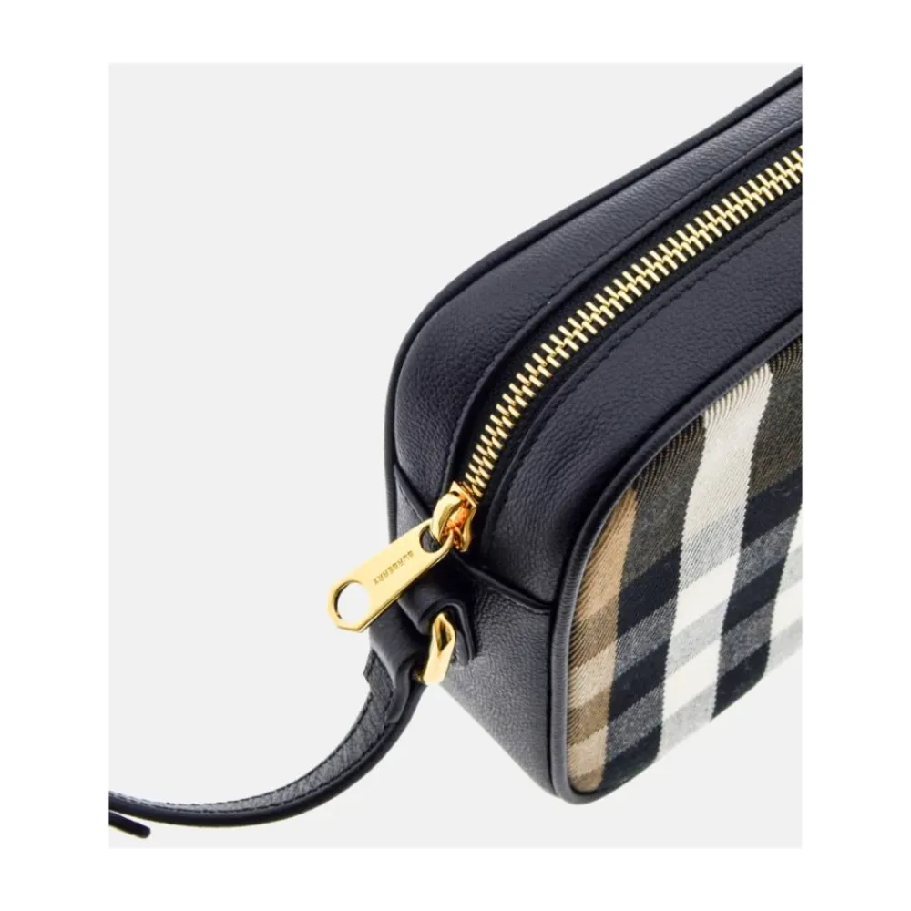 Løft din stil med denne Burberry kamerataske, der har et elegant sort, kornet læderdesign, suppleret med et signatur house check-print. Produkt detaljer: Sort | Multicolor | Læder | Bomuld | Justerbar crossbody-rem i læder | Lynlåslukning | House check-print | Indvendig åben lomme | Dimensioner og pasform: 19,5 cm bredde x 14 cm højde x 5,5 cm dybde |