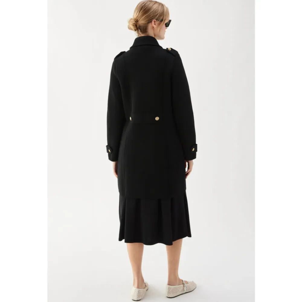 Busnel Marina Coat er en klassisk, dobbeltradet uldfrakke, der er defineret af sine militærinspirerede detaljer. Dens karakteristiske otte gyldne ankerknapper tilføjer et markant fokuspunkt, samtidig med at den er alsidig til hverdagsbrug. Nøgleattributter: Sort | Uld | Dobbeltradet knaplukning | Dobbeltradet design | Otte gyldne ankerknapper foran og ved manchetterne | Militærinspireret silhuet | Dimensioner og pasform: Normal i størrelsen – tag din normale størrelse | Modellen er 175 cm høj og bærer størrelse 38 | Sammensætning og pleje: 100% uld | Må kun renses.