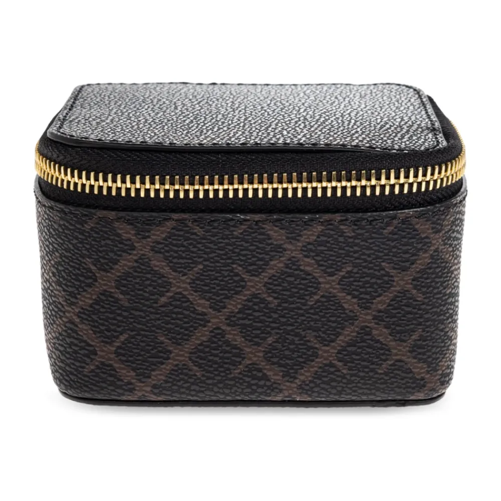 By Malene Birger Bae Bijoux Smykkeskrin kombinerer et minimalistisk skandinavisk look med et struktureret, kornet materiale for at holde smykker organiseret og beskyttet derhjemme eller på farten. Nøgleattributter: Sort | Polyvinylchlorid | Rejsevenlig beskyttelse | Sikker lukning | Lynlåslukning | Polstret indre | Flere indvendige lommer til organisering | Rektangulær form med let afrundede kanter | Kornet tekstureret overflade | Subtil mørkebrun geometrisk monogrammønster | Guldfarvet metal lynlåsdetalje | Mål og pasform: Højde: 17 cm | Bredde: 11 cm | One size | Kompakt rejsevenlig størrelse | Sammensætning og pleje: Hovedmateriale: 100% Polyvinylchlorid
