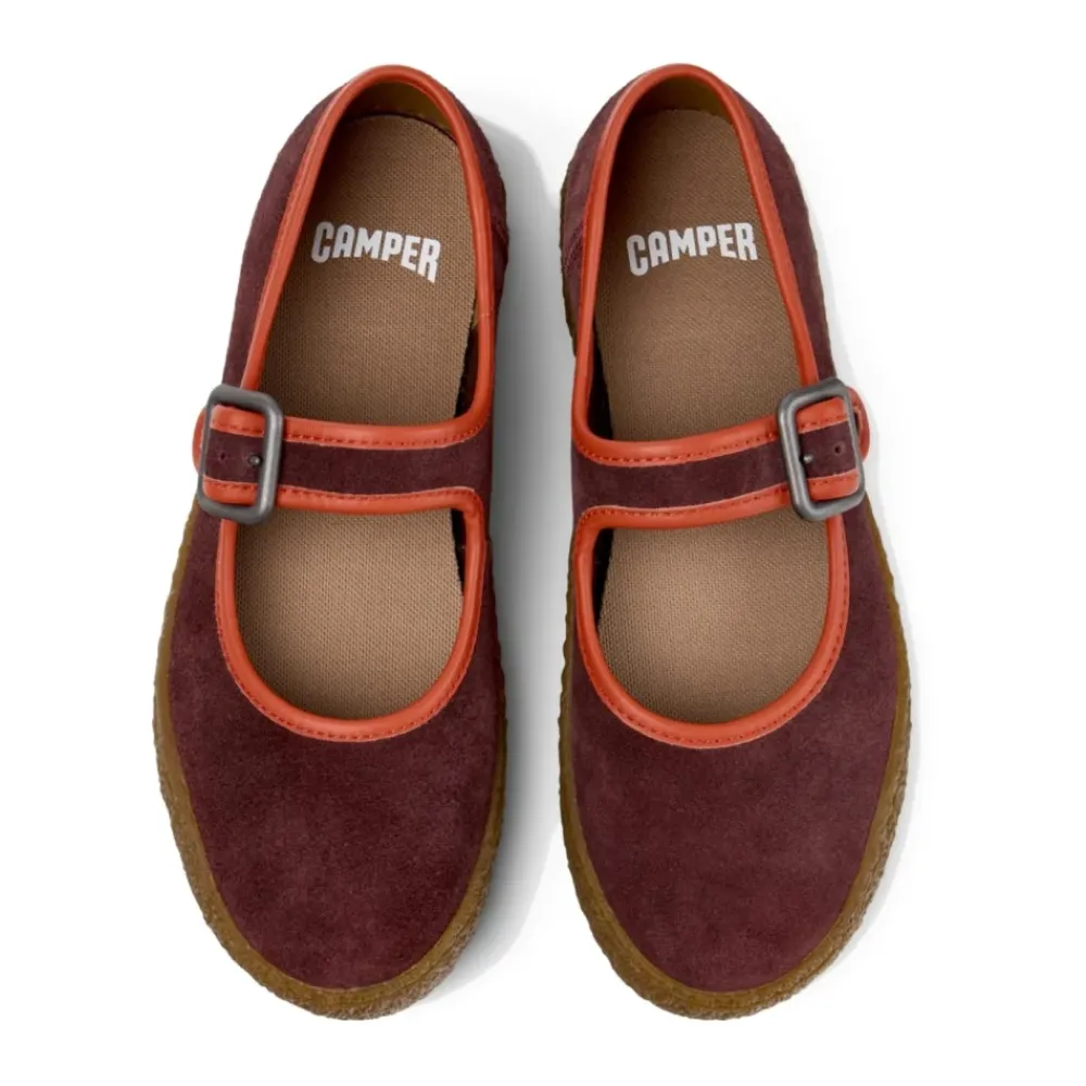 Camper Peu Terreno Mary Jane kombinerer en klassisk Mary Jane silhuet med en 360° syet crepe gummisål for hverdagsbrug og øget holdbarhed. Vigtige egenskaber: Bordeaux | Orange | Læder, nubuck | 360° syet crepe gummisål for holdbarhed og beskyttelse | Justerbar spændelukning på vristen | OrthoLite® fodseng for stødabsorbering | Mary Jane silhuet | Orange piping trim | Sammensætning & pleje: Læder | Nubuck | Crepe gummi ydersål | OrthoLite® fodseng | Brug passende læder- og nubuckplejeprodukter; undgå maskinvask. Se Camper Shoe Care Guide for detaljerede instruktioner.