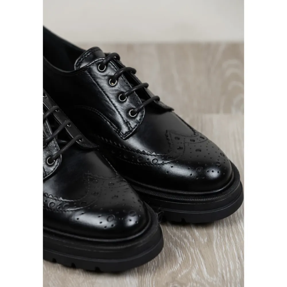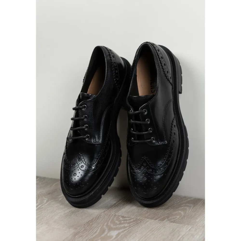 Carmens Patty Derby Sierra A56117 er en Oxford-inspireret snøresko med en chunky, profileret sål, der kombinerer klassisk engelsk stil med blødt kalveskind for hverdagsbrug. Vigtige egenskaber: Sort | Nero | Kalveskindslæder | TR profileret sål for godt fodfæste | Snørelukning | Blødt kid læderfor for komfort | Oxford silhuet | Profileret (carrarmato) sål | Lav blokhæl | Dimensioner og pasform: Hælhøjde: 2 cm | Normal pasform – vælg din sædvanlige skostørrelse. | Sammensætning og pleje: Overdel: Kalveskindslæder | For: Blødt kid (gedeskind) læder | Sål: TR