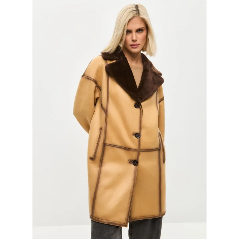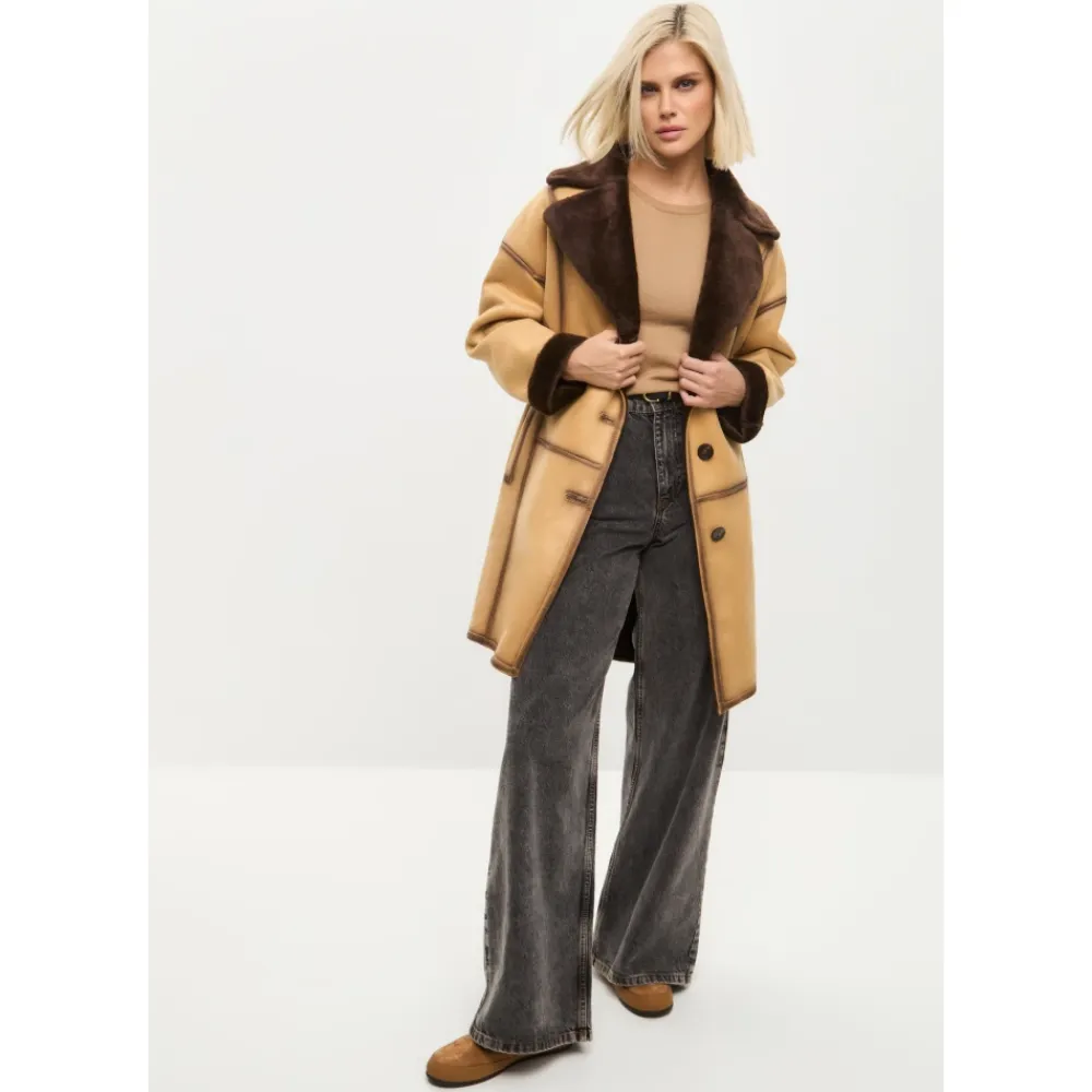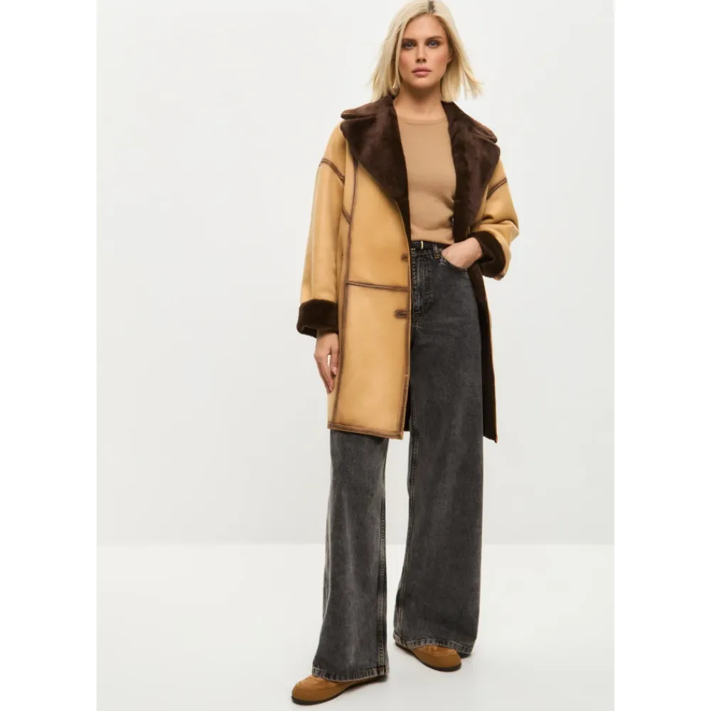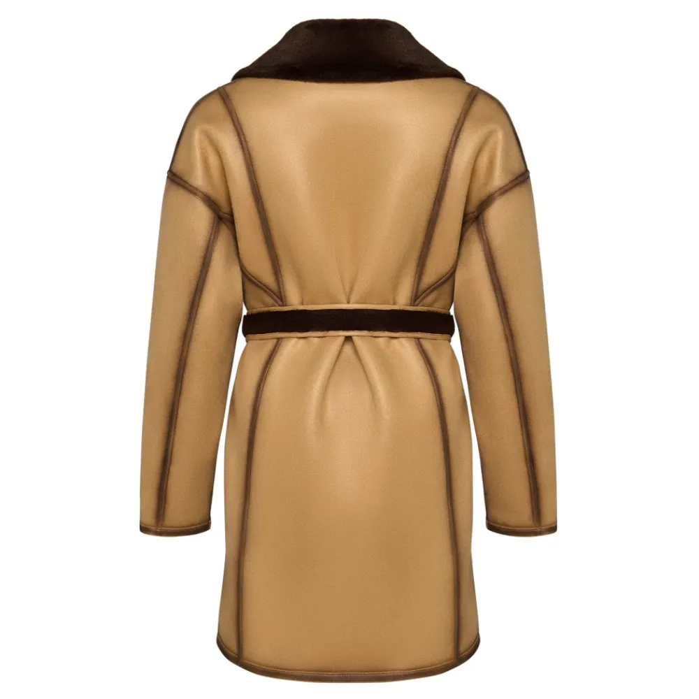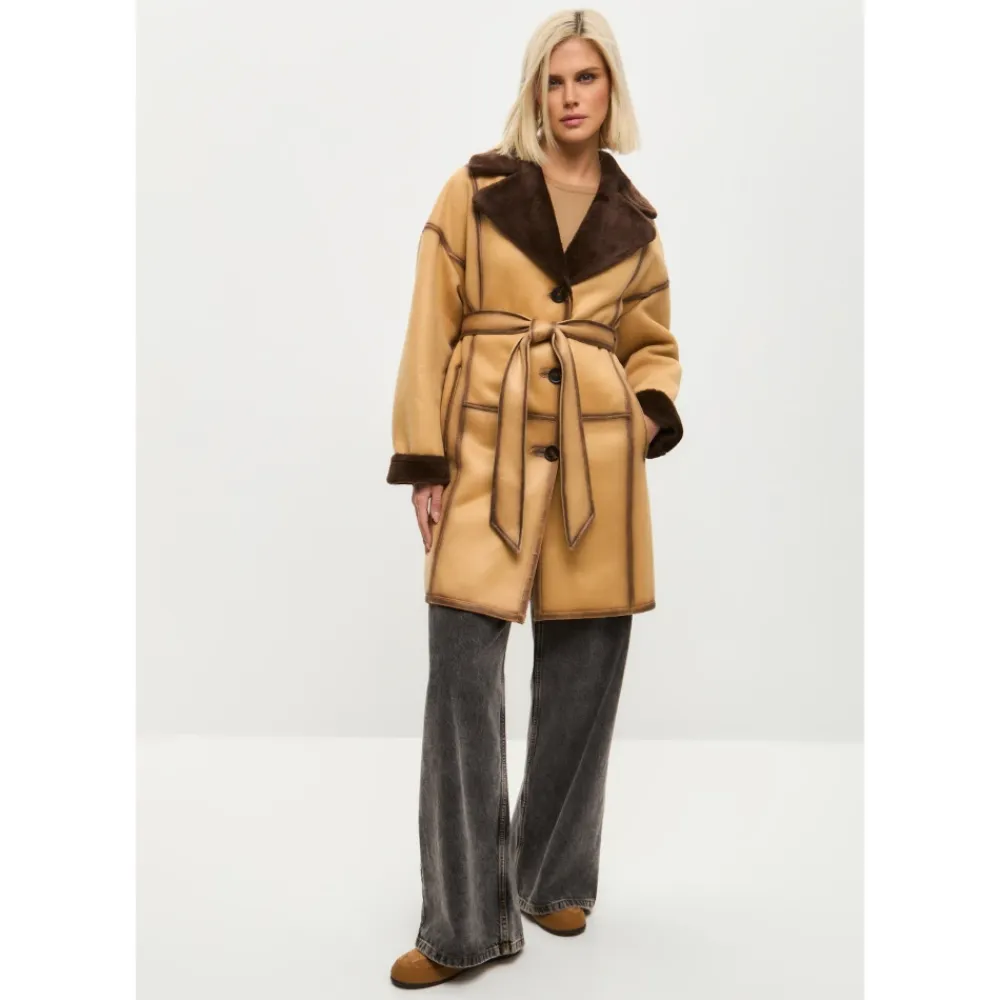 Denne iøjnefaldende knaplukket lange frakke i imiteret materiale kombinerer elegance og praktisk anvendelighed. Med en knaplukning og et taljebælte giver den en skræddersyet silhuet med maksimal varme og komfort fra imiteret pelsfor. Produkt detaljer: Lys Brun | Brun | Imiteret Læder (Polyesterblanding) | Vendbar | Justerbart taljebælte | Stor reverskrave med imiteret pelsdetaljer | Langt design | Sammensætning og pleje: 43% Modakryl | 36% Polyester | 21% Akryl | Ikke specificeret