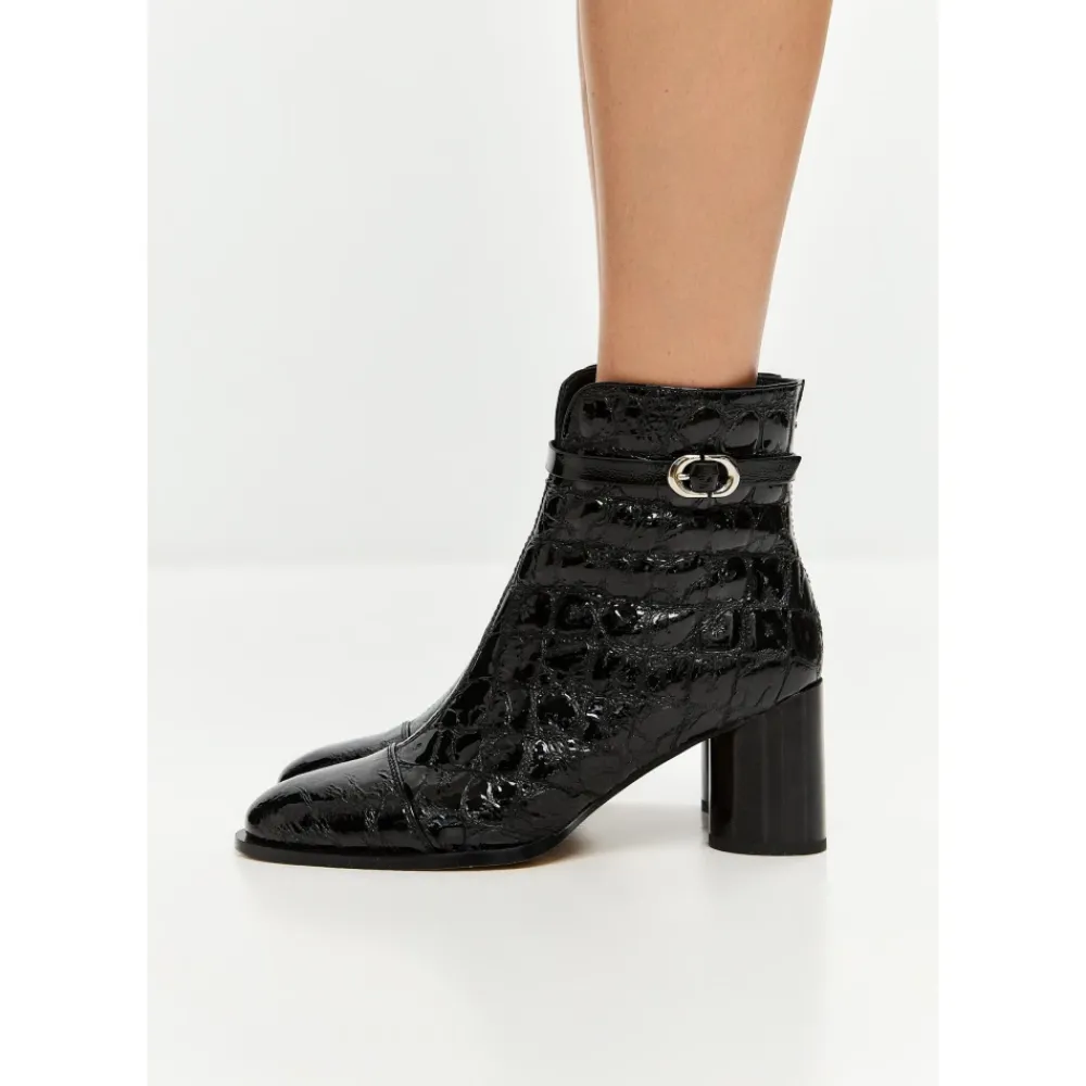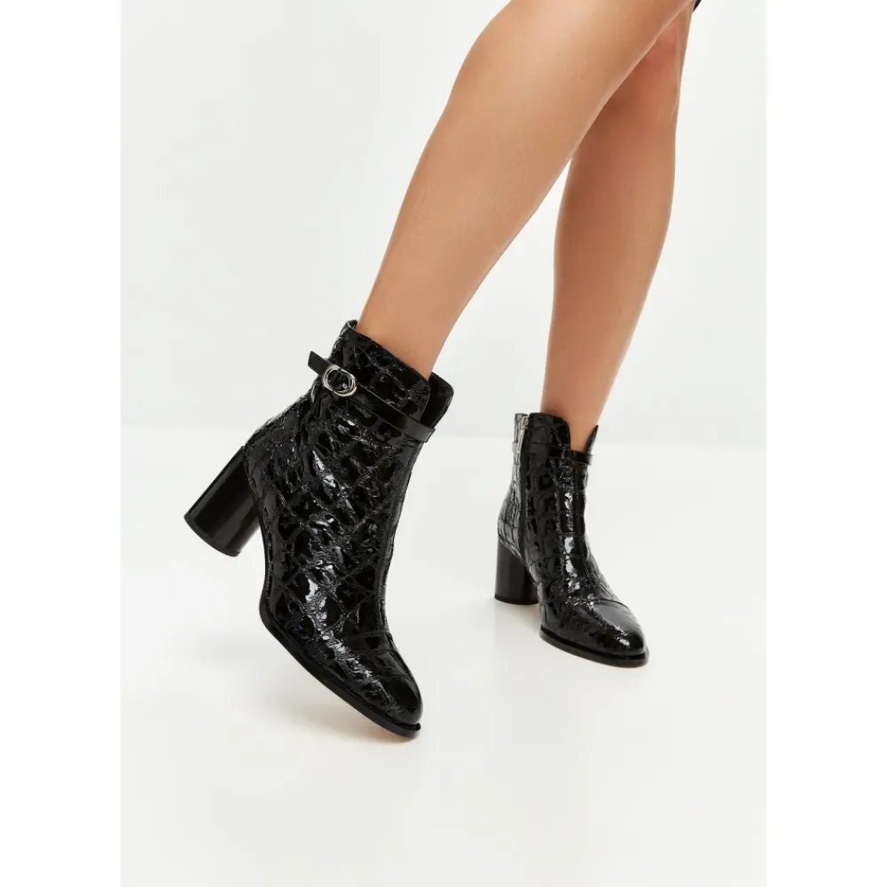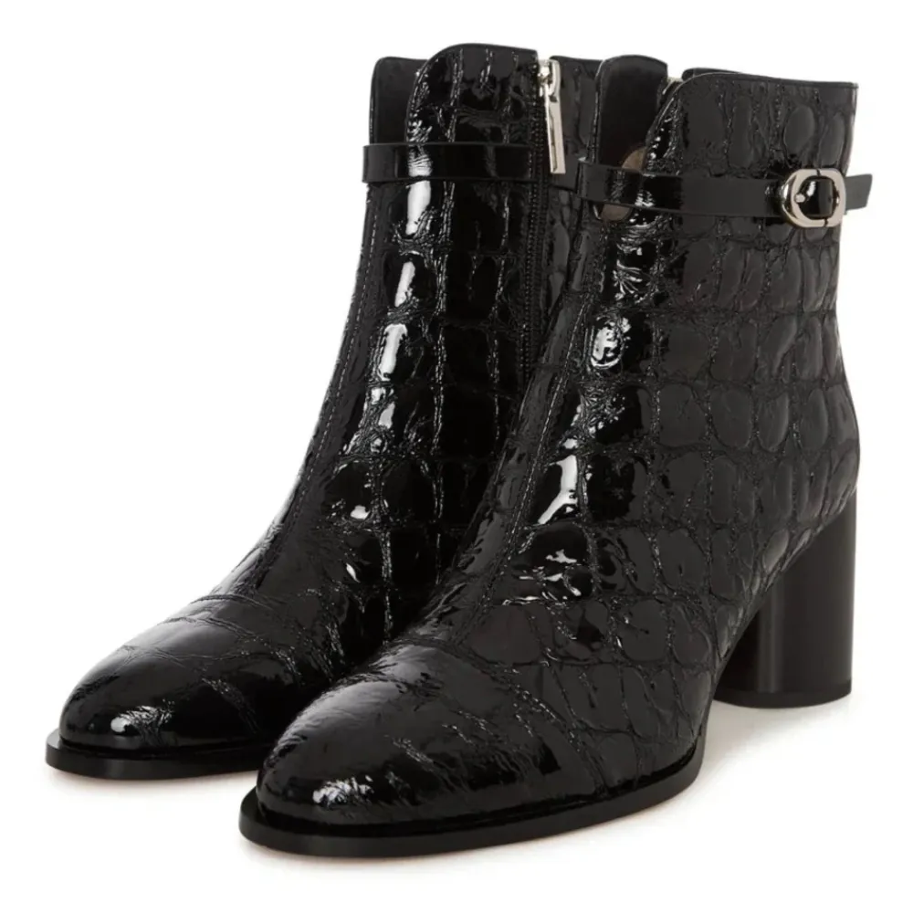 Udlev elegant sofistikation med Midnight Croc Block Boots. Med en slående præget tekstur og en moderne spænde detalje er disse ankelstøvler et go-to valg til kantet forfinelse og dag-til-aften overgange. Materiale: Læder Foring: Læderforing Polstringstype: Kold polstring Skospids: Mandel tå Lukning: Lynlås i siden Sål: Gummisål Detaljer: Krokopræget tekstur, metallisk spænde, blank finish Hæltype: Blokhæl Hælhøjde: 9 cm Plateauhøjde: n/a Skafthøjde: n/a Skofit: Almindelig Vedligeholdelsesinstruktioner: Undgå at placere læderet i direkte sollys eller ekstrem varme. Rengør med skum fra sæbeflager til husrengøring. Undgå at læderet bliver gennemblødt eller kommer i kontakt med skarpe genstande. Ved spild skal det straks absorberes med en ren, tør klud.