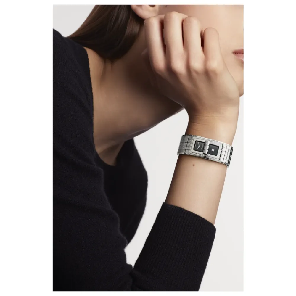 Chanel Code Coco Armbånd er et ur i smykkestil, der kombinerer en rektangulær urkasse i rustfrit stål med sortlakerede urskiver – den ene med en princess-cut diamant – til raffineret festtøj og særlige lejligheder. Nøgleattributter: Sort | Stål | Rustfrit stål | Vandafvisende til 30 m (3 ATM) | Safirkrystal | Armbånd i rustfrit stål med foldelås | Quartz-urværk for minimal vedligeholdelse | Rektangulær urkasse | Sortlakeret urskive | En urskive med en princess-cut diamant (~0,05 ct) | Slank profil | Dimensioner og pasform: 38,1 x 21,5 mm | Sammensætning og pleje: Urkasse i rustfrit stål | Armbånd i rustfrit stål | Safirkrystal | Princess-cut diamant (~0,05 ct) | Quartz-urværk | Aftørres med en blød klud. Undgå nedsænkning ud over vandtæthedsvurderingen. Få urværket serviceret af en autoriseret tekniker.
