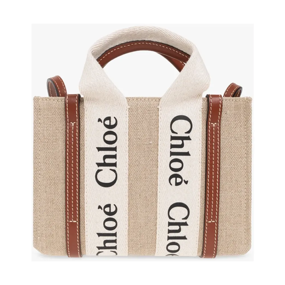 Beige, brun og fløde ‘Woody Mini’ skuldertaske fra Chloe. Lavet af linned og kantet med kalveskind, dette design har et trykt sort logo, to halvrunde håndtag, en justerbar rem og en intern rum med en slip lomme. Højde: 15 cm Bredde: 20 cm Modellens målinger Højde: 176 cm Buste: 85 cm Talje: 60 cm Hofter: 89 cm