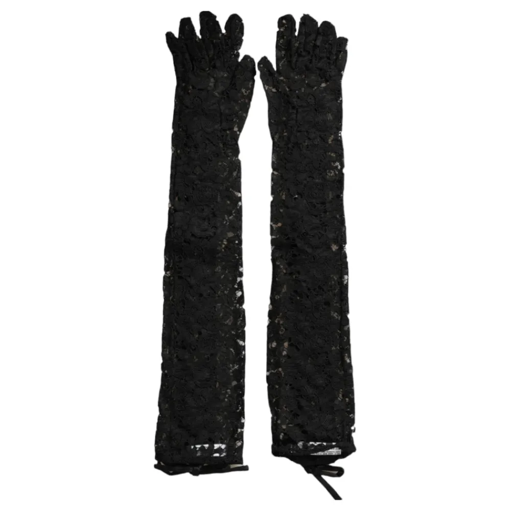 Forhøj din stil med disse 100% autentiske Dolce & Gabbana albuelange blonderhandsker. Fremstillet i Italien med håndværk af høj kvalitet, disse sorte blonderhandsker har logo detaljer for et strejf af luksus.